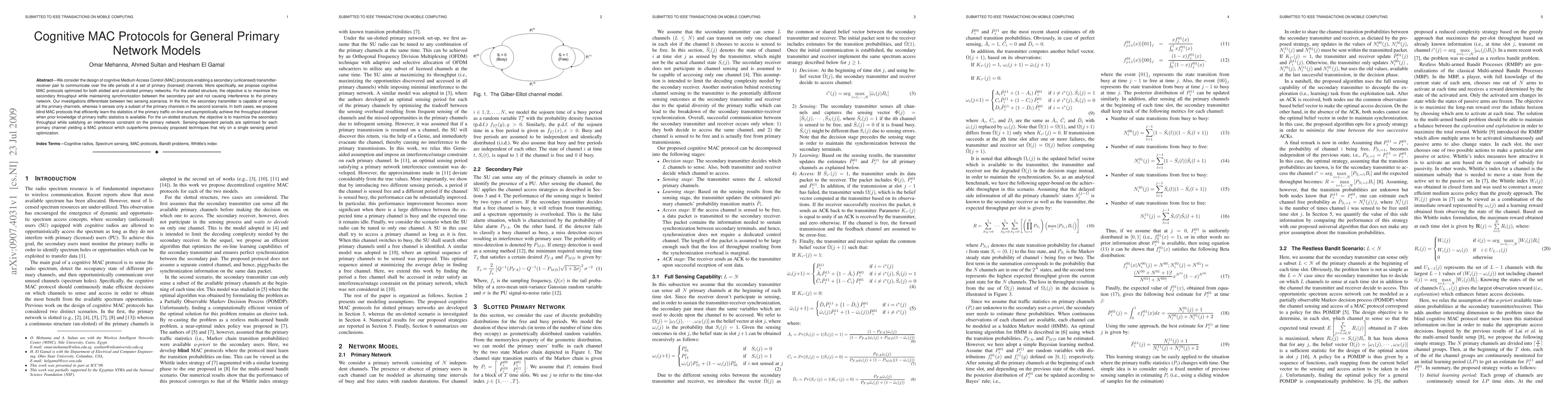 This paper proposes cognitive MAC protocols for secondary networks that operate during idle periods of primary channels, optimizing for both slotted and un-slotted structures. It maximizes secondary throughput while ensuring no interference to primary networks and introduces sensing-dependent periods to outperform existing techniques.