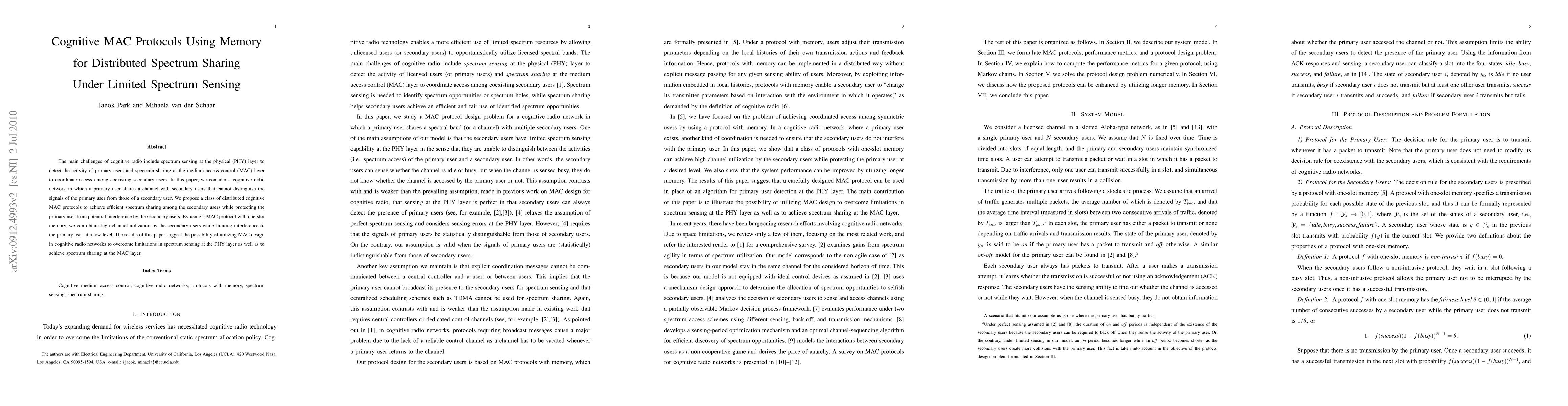This paper proposes distributed cognitive MAC protocols with one-slot memory to enable efficient spectrum sharing among secondary users while protecting primary users from interference, addressing limitations in physical layer spectrum sensing. The approach achieves high channel utilization for secondary users with minimal interference.