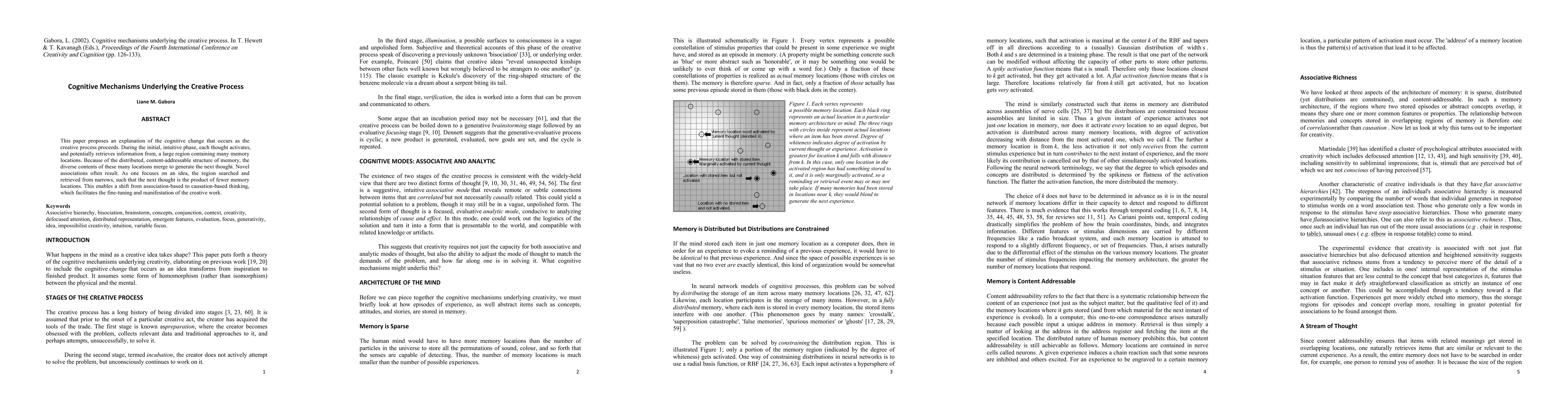 This paper proposes an explanation of the cognitive change that occurs as the creative process proceeds. During the initial, intuitive phase, each thought activates, and potentially retrieves information from, a large region containing many memory locations. Because of the distributed, content-addressable structure of memory, the diverse contents of these many locations merge to generate the next thought. Novel associations often result. As one focuses on an idea, the region searched and retrieved from narrows, such that the next thought is the product of fewer memory locations. This enables a shift from association-based to causation-based thinking, which facilitates the fine-tuning and manifestation of the creative work.