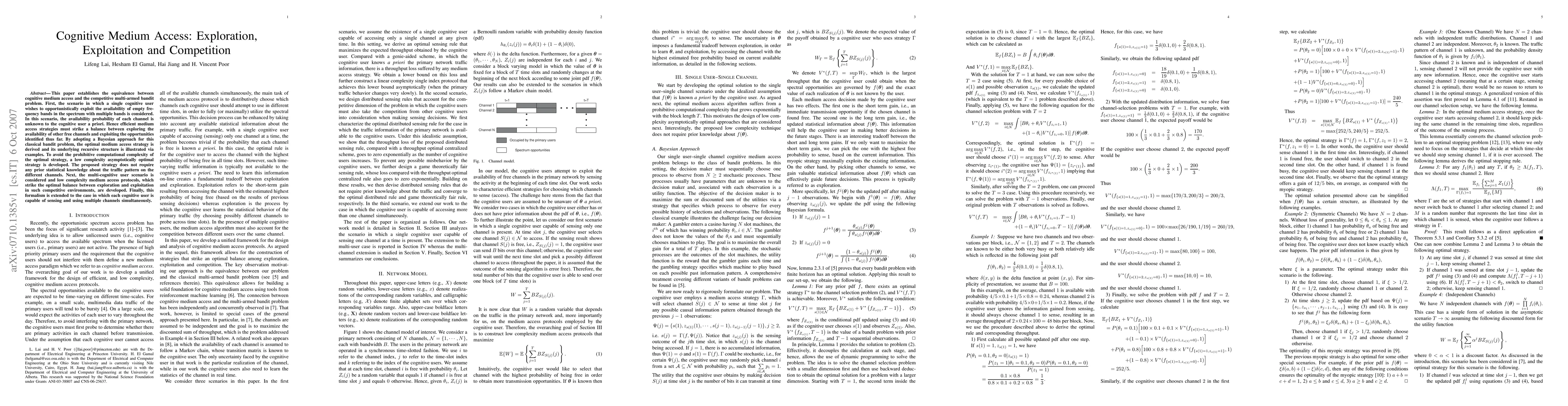The paper establishes the equivalence between cognitive medium access and the competitive multi-armed bandit problem, deriving optimal and low-complexity strategies for single and multiple cognitive users, including scenarios with simultaneous multi-channel sensing.