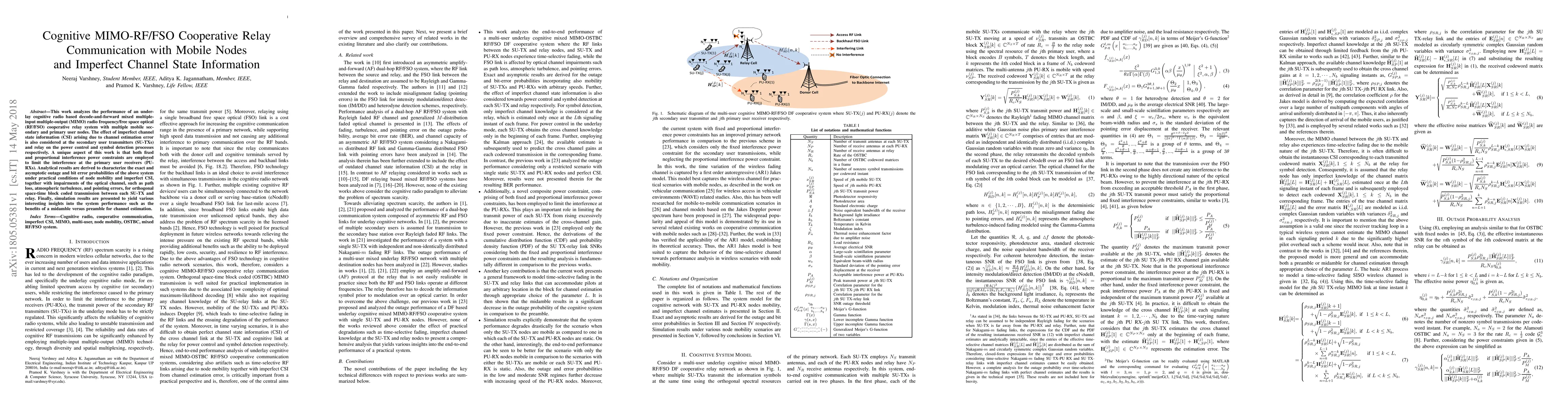 This paper evaluates the performance of a cognitive radio-based MIMO RF/FSO cooperative relay system with mobile nodes, considering imperfect channel state information and both fixed and proportional interference constraints. Analytical and simulation results reveal insights into outage and bit error probabilities under practical conditions.