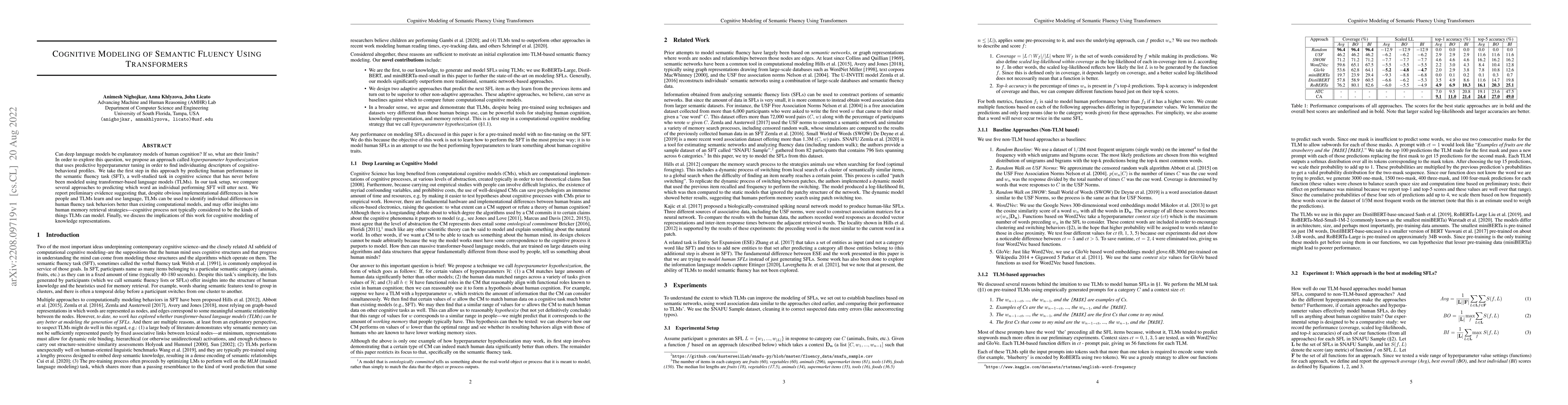 Can deep language models be explanatory models of human cognition? If so, what are their limits? In order to explore this question, we propose an approach called hyperparameter hypothesization that uses predictive hyperparameter tuning in order to find individuating descriptors of cognitive-behavioral profiles. We take the first step in this approach by predicting human performance in the semantic fluency task (SFT), a well-studied task in cognitive science that has never before been modeled using transformer-based language models (TLMs). In our task setup, we compare several approaches to predicting which word an individual performing SFT will utter next. We report preliminary evidence suggesting that, despite obvious implementational differences in how people and TLMs learn and use language, TLMs can be used to identify individual differences in human fluency task behaviors better than existing computational models, and may offer insights into human memory retrieval strategies -- cognitive process not typically considered to be the kinds of things TLMs can model. Finally, we discuss the implications of this work for cognitive modeling of knowledge representations.