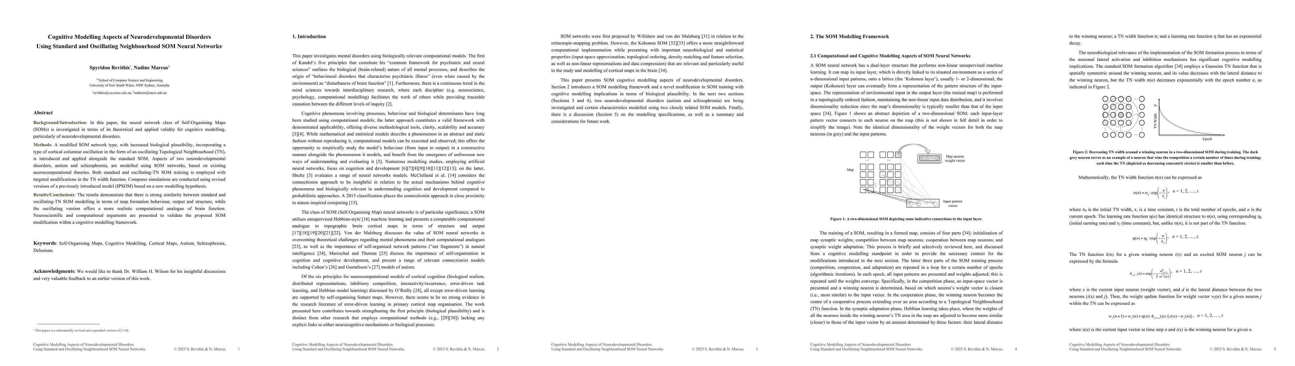Background/Introduction: In this paper, the neural network class of Self-Organising Maps (SOMs) is investigated in terms of its theoretical and applied validity for cognitive modelling, particularly of neurodevelopmental disorders. Methods: A modified SOM network type, with increased biological plausibility, incorporating a type of cortical columnar oscillation in the form of an oscillating Topological Neighbourhood (TN), is introduced and applied alongside the standard SOM. Aspects of two neurodevelopmental disorders, autism and schizophrenia, are modelled using SOM networks, based on existing neurocomputational theories. Both standard and oscillating-TN SOM training is employed with targeted modifications in the TN width function. Computer simulations are conducted using revised versions of a previously introduced model (IPSOM) based on a new modelling hypothesis. Results/Conclusions: The results demonstrate that there is strong similarity between standard and oscillating-TN SOM modelling in terms of map formation behaviour, output and structure, while the oscillating version offers a more realistic computational analogue of brain function. Neuroscientific and computational arguments are presented to validate the proposed SOM modification within a cognitive modelling framework.