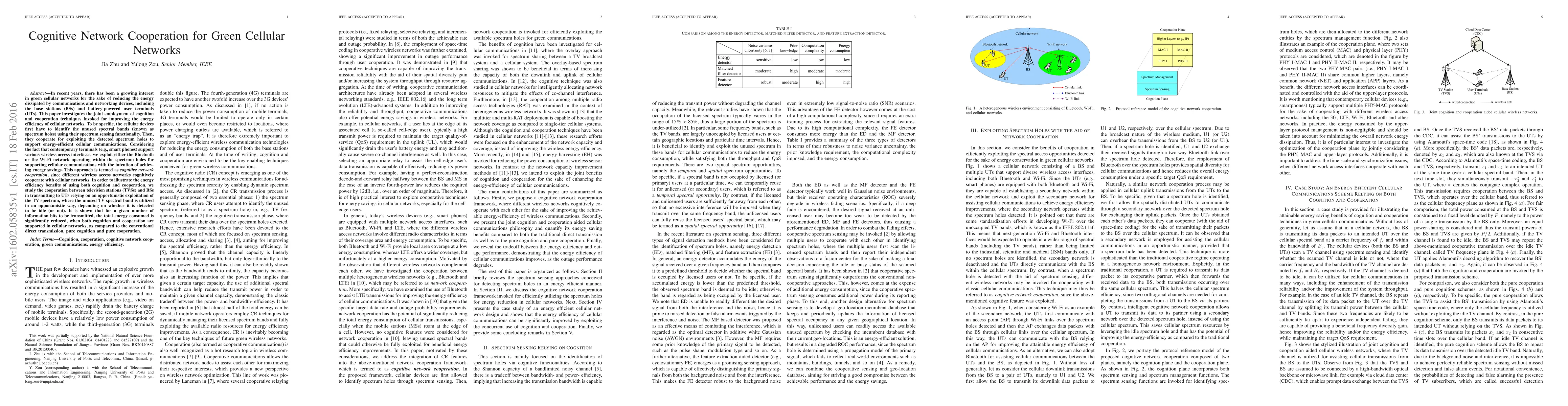 This paper proposes 'cognitive network cooperation' to enhance energy efficiency in cellular networks. It suggests using spectrum holes identified via spectrum sensing and cooperating across wireless access networks like Bluetooth or Wi-Fi for cellular communications, significantly reducing energy consumption compared to conventional methods.