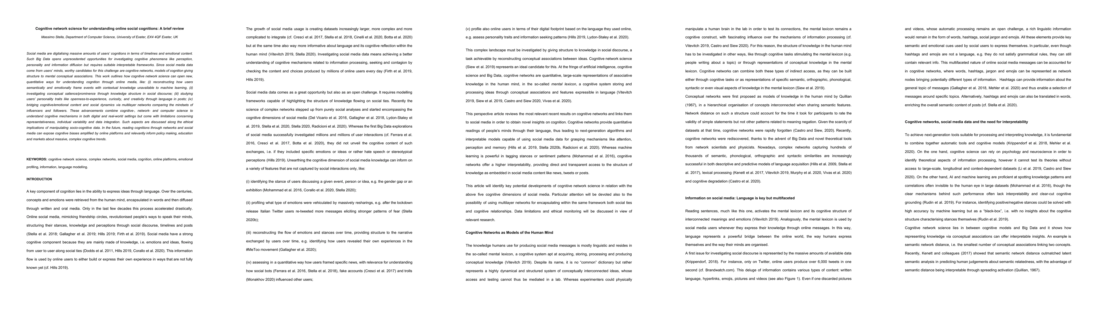 This paper reviews how cognitive network science leverages social media data to quantitatively understand online social cognitions, including perception, personality, and information diffusion. It highlights the potential of cognitive networks to reconstruct users' semantic and emotional framing, investigate conceptual salience, and study personality traits through language, while discussing limitations and ethical implications.