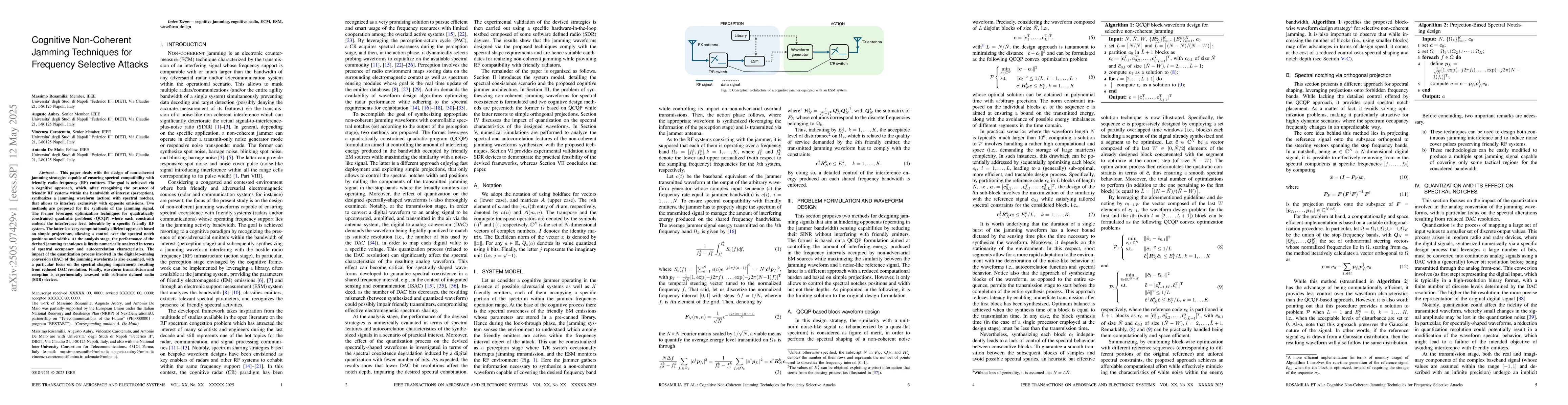 The main technical contribution lies in the development of cognitive non-coherent jamming techniques with spectral notches for frequency selective attacks, ensuring compatibility with friendly RF systems.