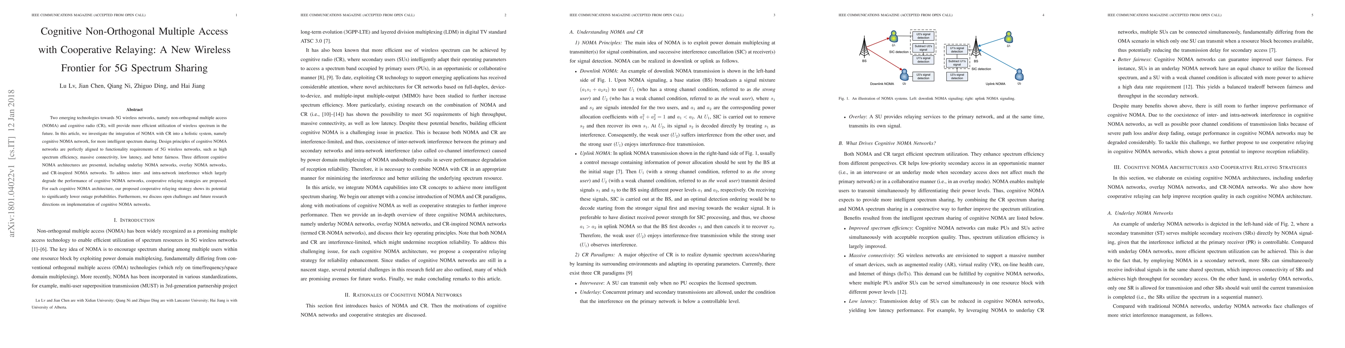 This paper explores the integration of non-orthogonal multiple access (NOMA) with cognitive radio (CR) to create cognitive NOMA networks for efficient 5G spectrum sharing. It proposes cooperative relaying strategies to mitigate interference and presents three cognitive NOMA architectures, highlighting their potential to enhance spectrum efficiency and fairness.