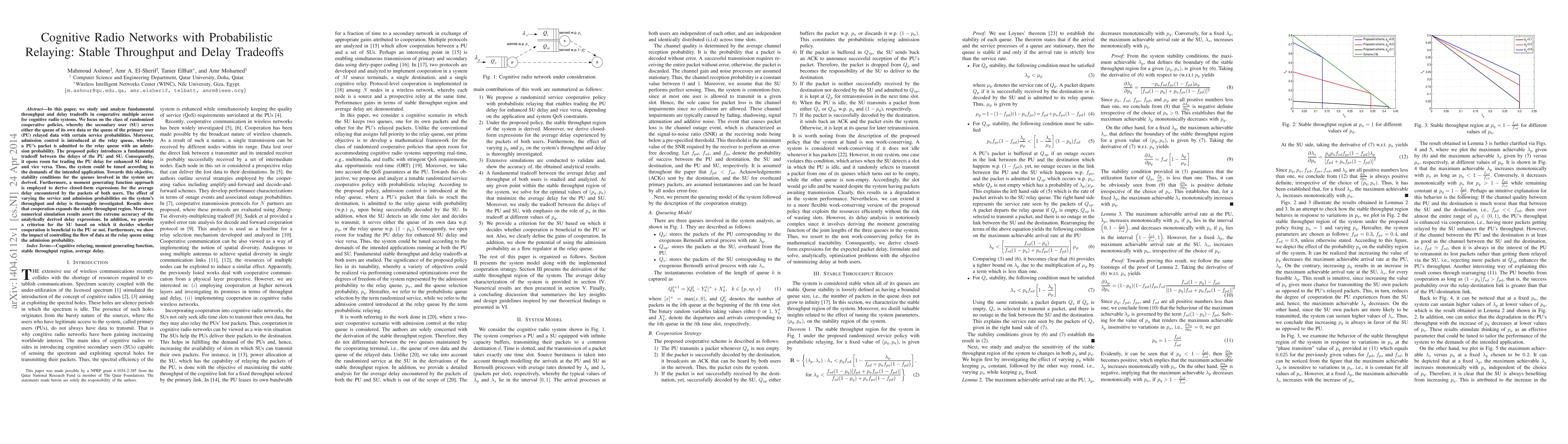 This paper explores throughput and delay tradeoffs in cognitive radio networks using probabilistic relaying. It introduces a cooperative policy where secondary users can serve either their own data or primary user relayed data with certain probabilities, and employs admission control at the relay queue. The analysis reveals a fundamental delay tradeoff between primary and secondary users, enabling system tuning based on application needs, and provides stability conditions and closed-form expressions for average delay.
