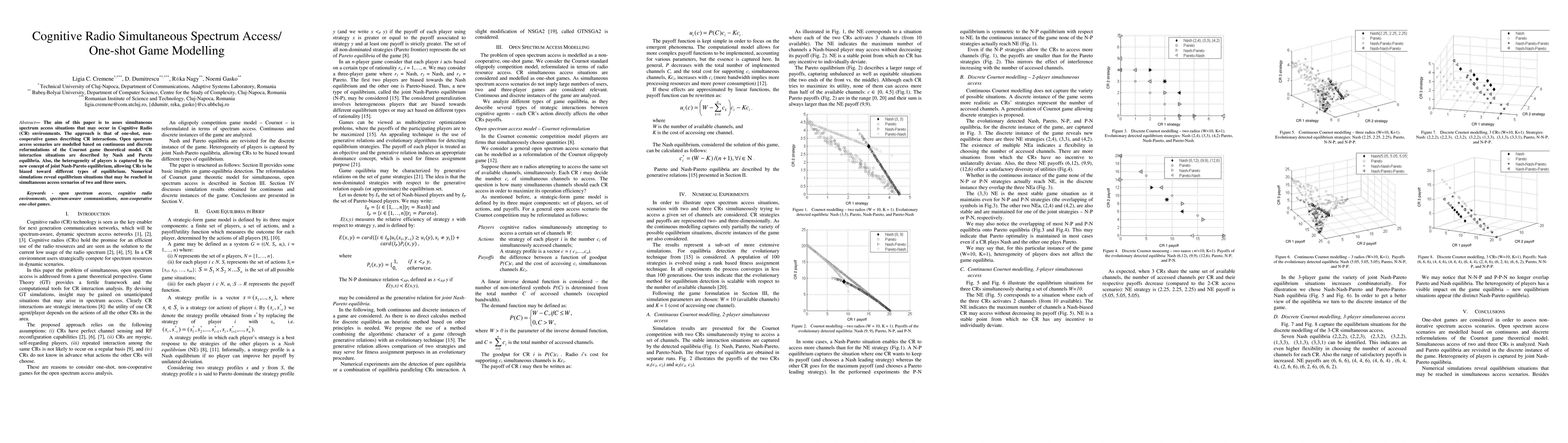 This paper explores simultaneous spectrum access in Cognitive Radio environments using one-shot, noncooperative game theory, modeling scenarios with Cournot game adaptations. It introduces joint Nash-Pareto equilibrium to account for player heterogeneity, and simulations reveal potential equilibria in two and three user scenarios.