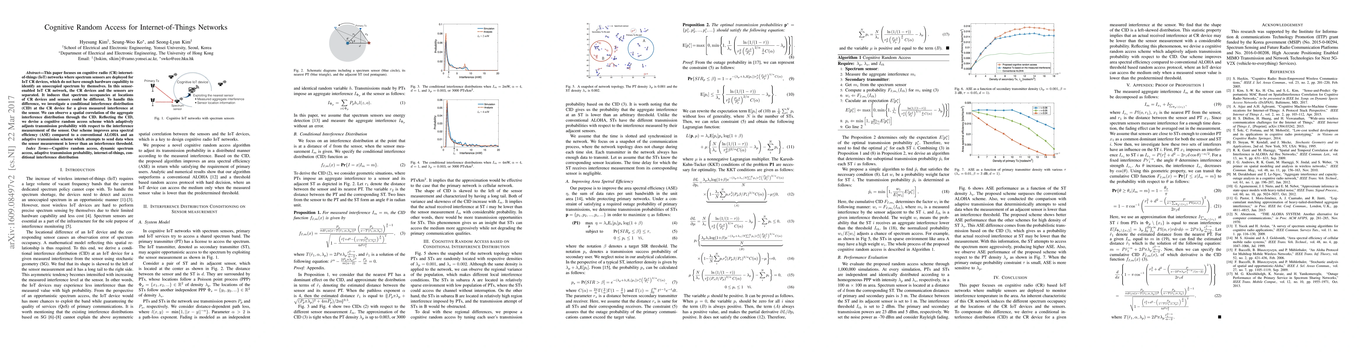 A new cognitive random access scheme is proposed for IoT networks to improve area spectral efficiency by adapting transmission probability based on sensor-measured interference. The scheme outperforms conventional ALOHA and adaptive transmission methods in handling spatial correlation of aggregate interference distribution.