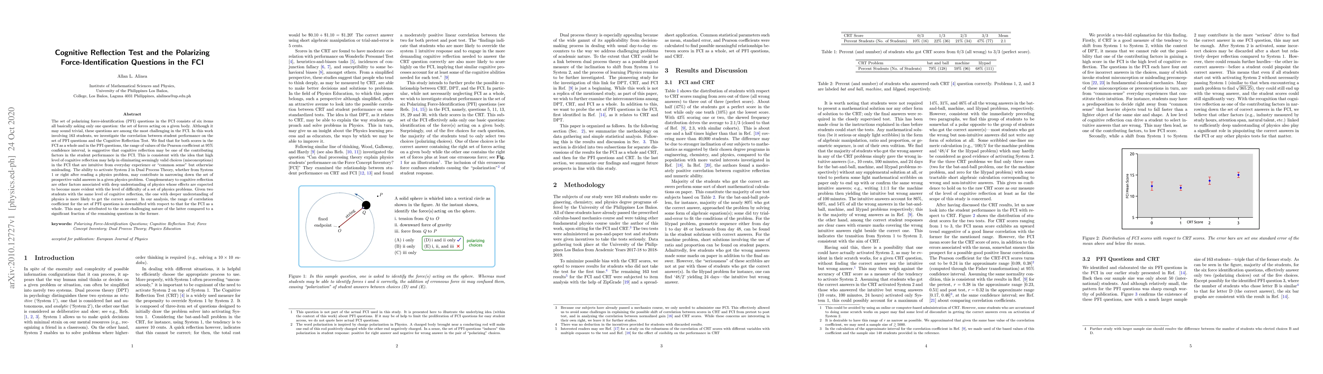 The set of polarizing force-identification (PFI) questions in the FCI consists of six items all basically asking only one question: the set of forces acting on a given body. Although it may sound trivial, these questions are among the most challenging in the FCI. In this work involving 163 students, we investigate the correlation between student performance on the set of PFI questions and the Cognitive Reflection Test. We find that for both scores in the FCI as a whole and in the PFI questions, the range of values of the Pearson coefficient at 95\% confidence interval, is suggestive that cognitive reflection may be one of the contributing factors in the student performance in the FCI. This is consistent with the idea that high level of cognitive reflection may help in eliminating seemingly valid choices (misconceptions) in the FCI that are intuitive from everyday experience or "common sense" but otherwise misleading. The ability to activate System 2 in Dual Process Theory, whether from System 1 or right after reading a physics problem, may contribute in narrowing down the set of prospective valid answers in a given physics problem. Complementary to cognitive reflection are other factors associated with deep understanding of physics whose effects are expected to become more evident with the level of difficulty of a set of physics problems. Given two students with the same level of cognitive reflection, the one with deeper understanding of physics is more likely to get the correct answer. In our analysis, the range of correlation coefficient for the set of PFI questions is downshifted with respect to that for the FCI as a whole. This may be attributed to the more challenging nature of the latter compared to a significant fraction of the remaining questions in the former.