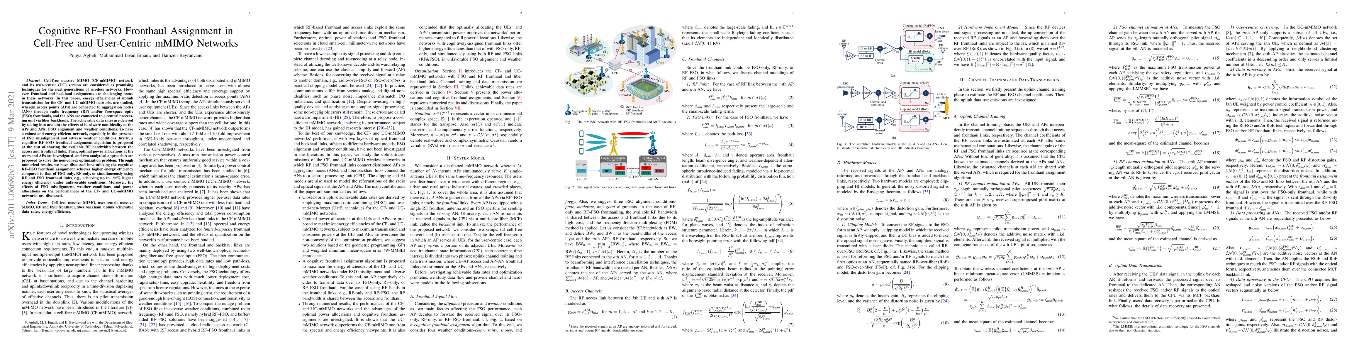 This paper proposes a cognitive RF-FSO fronthaul assignment algorithm for cell-free and user-centric massive MIMO networks, achieving up to 198% higher energy efficiency under adverse conditions compared to FSO-only or RF-only fronthaul links. The study also investigates optimal power allocations and derives achievable data rates considering hardware non-ideality and weather effects.