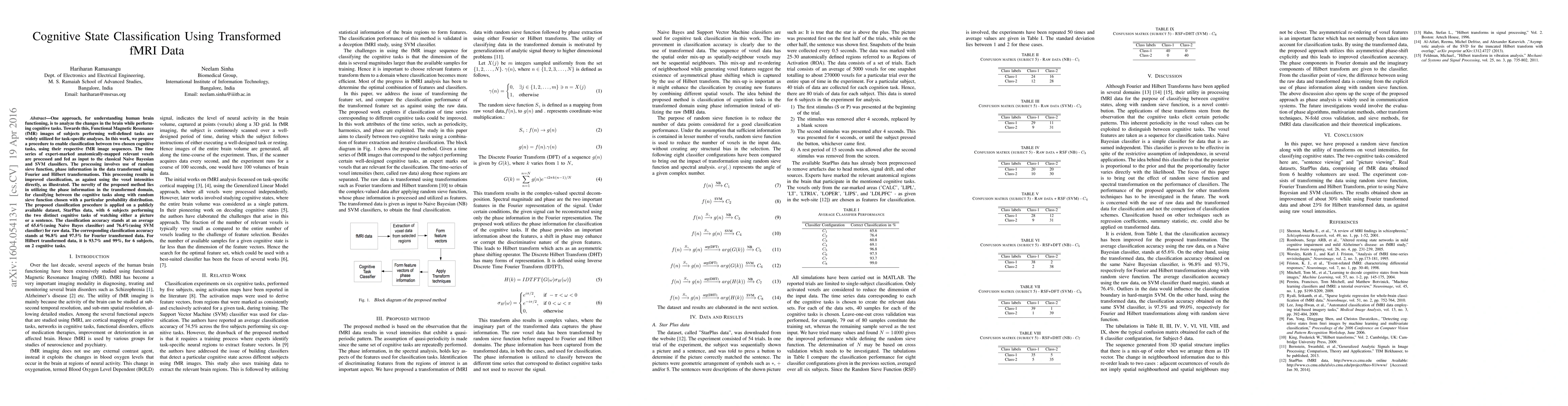 One approach, for understanding human brain functioning, is to analyze the changes in the brain while performing cognitive tasks. Towards this, Functional Magnetic Resonance (fMR) images of subjects performing well-defined tasks are widely utilized for task-specific analyses. In this work, we propose a procedure to enable classification between two chosen cognitive tasks, using their respective fMR image sequences. The time series of expert-marked anatomically-mapped relevant voxels are processed and fed as input to the classical Naive Bayesian and SVM classifiers. The processing involves use of random sieve function, phase information in the data transformed using Fourier and Hilbert transformations. This processing results in improved classification, as against using the voxel intensities directly, as illustrated. The novelty of the proposed method lies in utilizing the phase information in the transformed domain, for classifying between the cognitive tasks along with random sieve function chosen with a particular probability distribution. The proposed classification procedure is applied on a publicly available dataset, StarPlus data, with 6 subjects performing the two distinct cognitive tasks of watching either a picture or a sentence. The classification accuracy stands at an average of 65.6%(using Naive Bayes classifier) and 76.4%(using SVM classifier) for raw data. The corresponding classification accuracy stands at 96.8% and 97.5% for Fourier transformed data. For Hilbert transformed data, it is 93.7% and 99%, for 6 subjects, on 2 cognitive tasks.