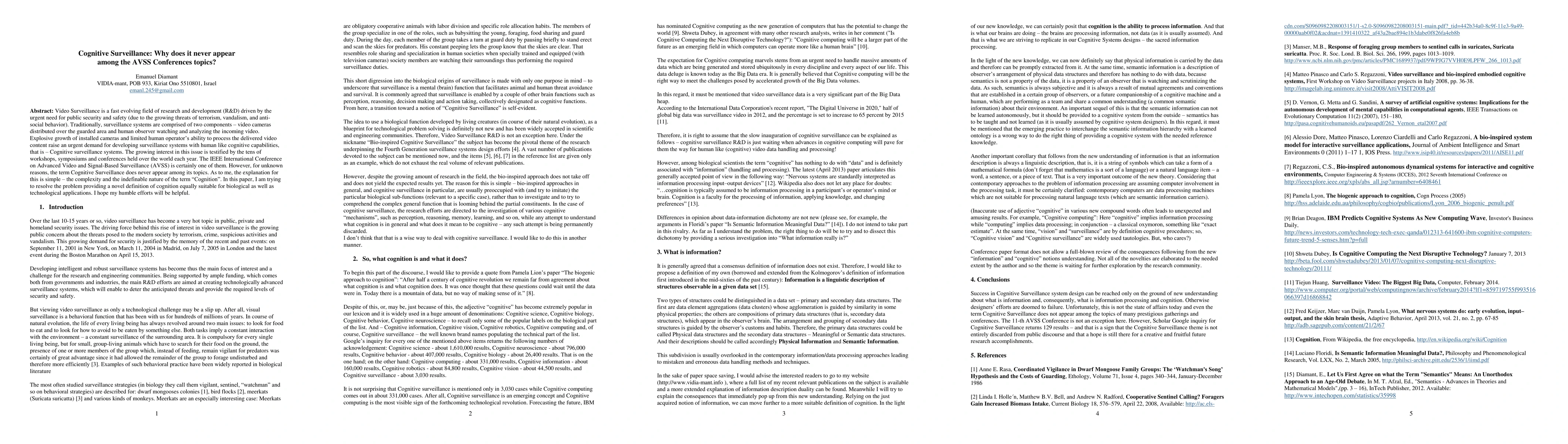 Video Surveillance is a fast evolving field of research and development (R&D) driven by the urgent need for public security and safety (due to the growing threats of terrorism, vandalism, and anti-social behavior). Traditionally, surveillance systems are comprised of two components - video cameras distributed over the guarded area and human observer watching and analyzing the incoming video. Explosive growth of installed cameras and limited human operator's ability to process the delivered video content raise an urgent demand for developing surveillance systems with human like cognitive capabilities, that is - Cognitive surveillance systems. The growing interest in this issue is testified by the tens of workshops, symposiums and conferences held over the world each year. The IEEE International Conference on Advanced Video and Signal-Based Surveillance (AVSS) is certainly one of them. However, for unknown reasons, the term Cognitive Surveillance does never appear among its topics. As to me, the explanation for this is simple - the complexity and the indefinable nature of the term "Cognition". In this paper, I am trying to resolve the problem providing a novel definition of cognition equally suitable for biological as well as technological applications. I hope my humble efforts will be helpful.