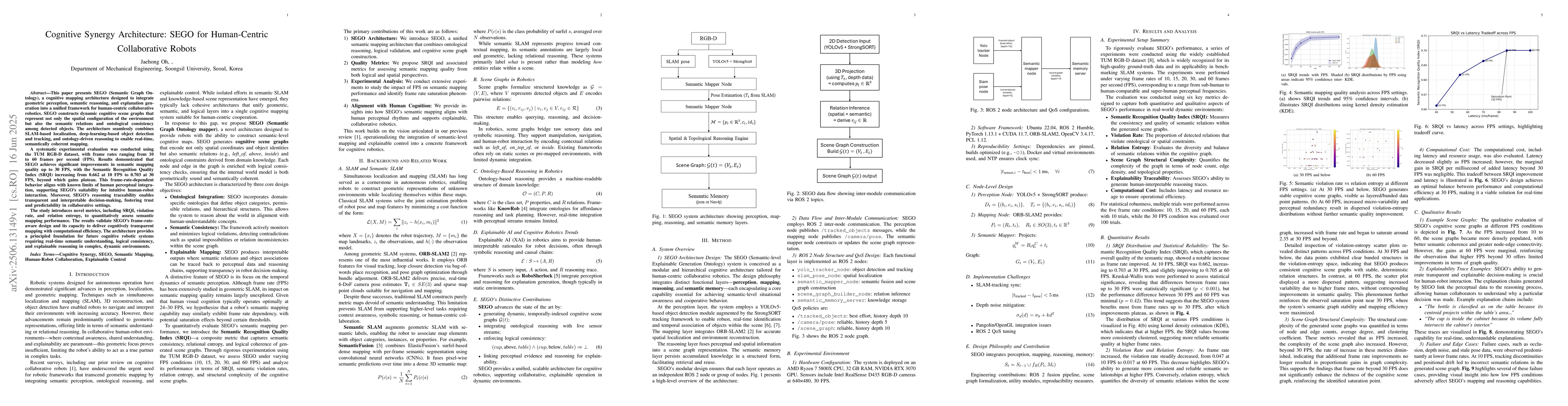 This paper presents SEGO (Semantic Graph Ontology), a cognitive mapping architecture designed to integrate geometric perception, semantic reasoning, and explanation generation into a unified framework for human-centric collaborative robotics. SEGO constructs dynamic cognitive scene graphs that represent not only the spatial configuration of the environment but also the semantic relations and ontological consistency among detected objects. The architecture seamlessly combines SLAM-based localization, deep-learning-based object detection and tracking, and ontology-driven reasoning to enable real-time, semantically coherent mapping.