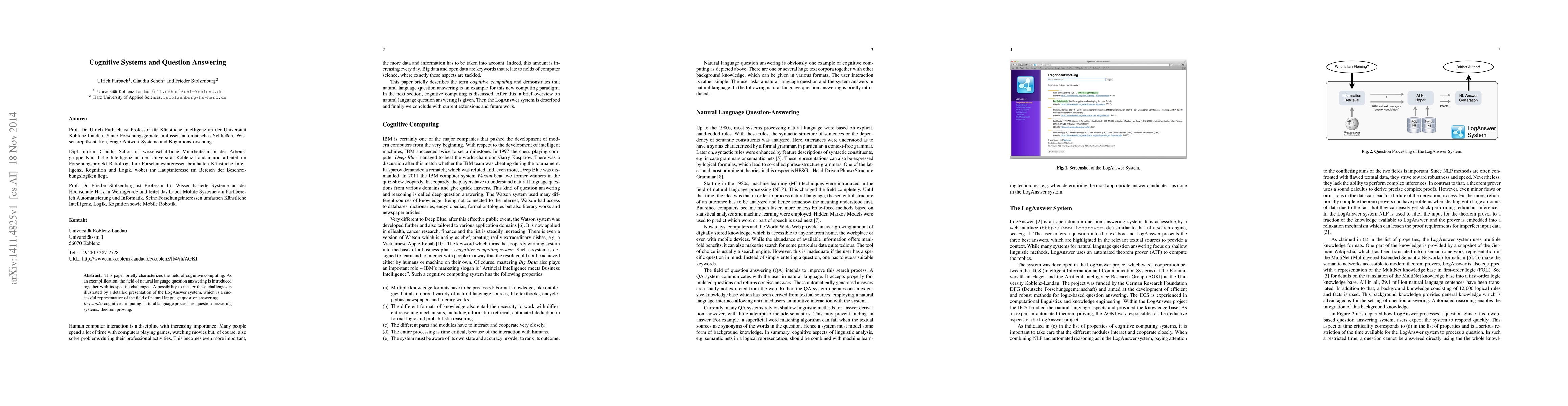 This paper outlines cognitive computing, focusing on natural language question answering as an example. It highlights challenges in this area and showcases LogAnswer, a successful system, as a solution.