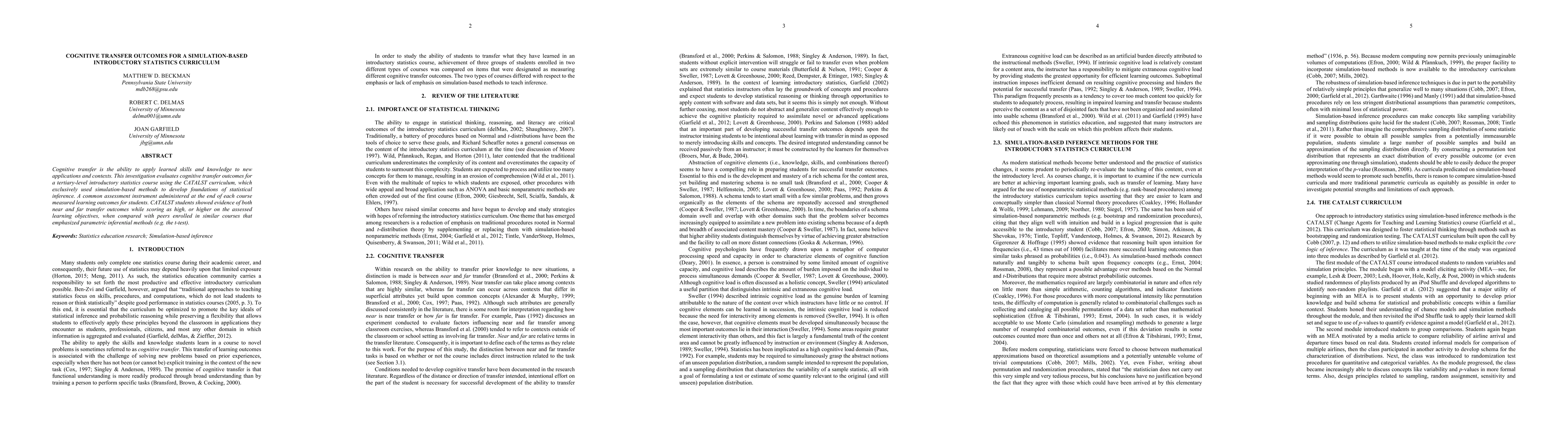 Cognitive transfer is the ability to apply learned skills and knowledge to new applications and contexts. This investigation evaluates cognitive transfer outcomes for a tertiary-level introductory statistics course using the CATALST curriculum, which exclusively used simulation-based methods to develop foundations of statistical inference. A common assessment instrument administered at the end of each course measured learning outcomes for students. CATALST students showed evidence of both near and far transfer outcomes while scoring as high, or higher on the assessed learning objectives, when compared with peers enrolled in similar courses that emphasized parametric inferential methods (e.g. the t-test).