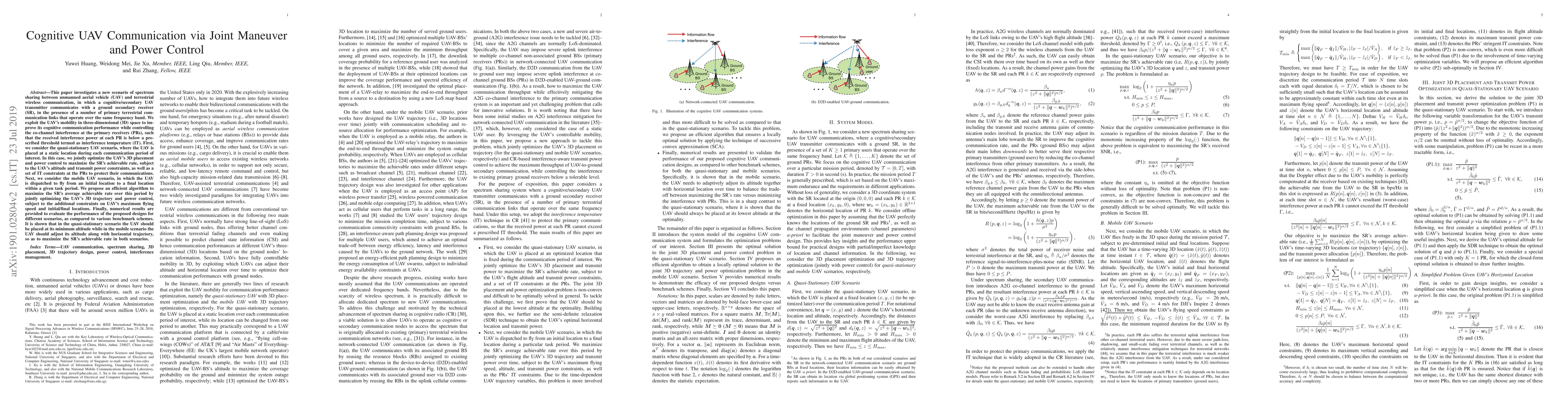 This paper explores spectrum sharing between a cognitive UAV and terrestrial communications, optimizing UAV's 3D placement and power control to maximize communication performance while minimizing interference. Results show that optimal UAV placement and power control vary based on whether the UAV is stationary or mobile.