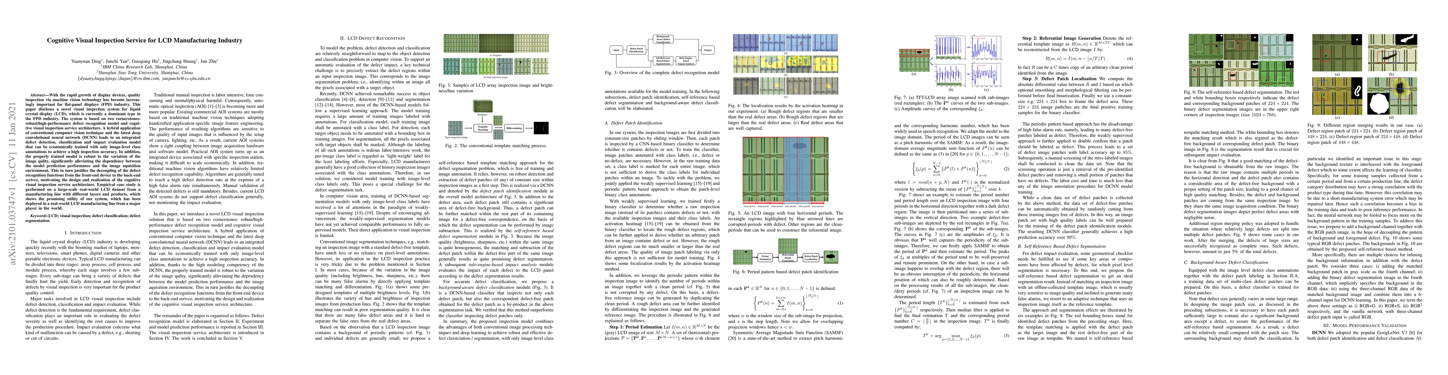 This paper presents a novel visual inspection system for LCD manufacturing using a hybrid model combining conventional computer vision and deep convolutional neural networks for robust defect recognition, and introduces a cognitive visual inspection service architecture to decouple defect detection from the image acquisition environment. The system has been deployed in a real-world manufacturing line, demonstrating high inspection accuracy and adaptability.