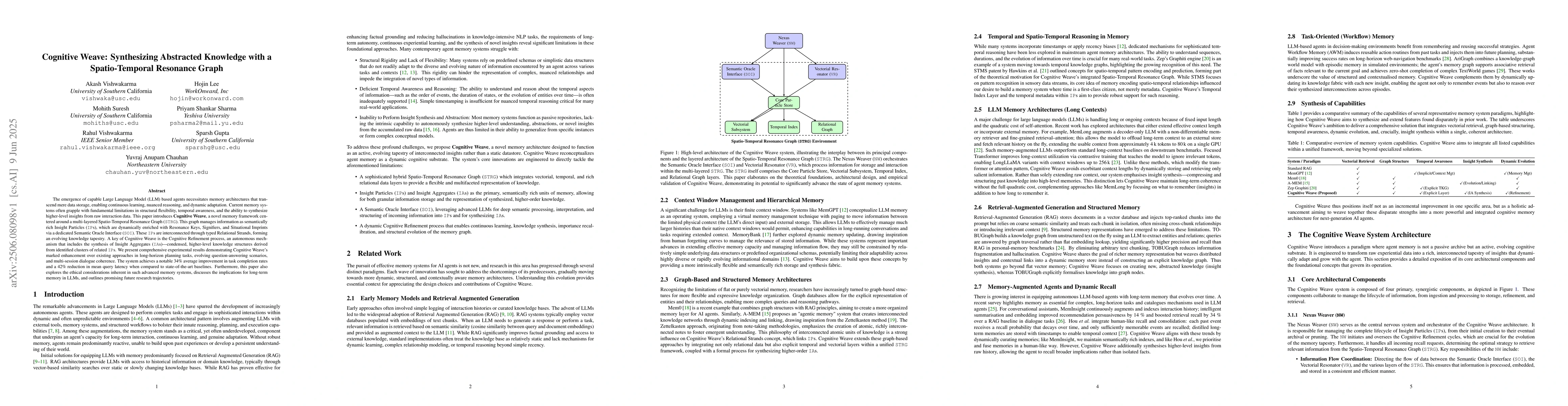 A new memory framework called Cognitive Weave improves LLMs' ability to learn, reason, and adapt through a spatio-temporal resonance graph that synthesizes abstracted knowledge into higher-level insights.