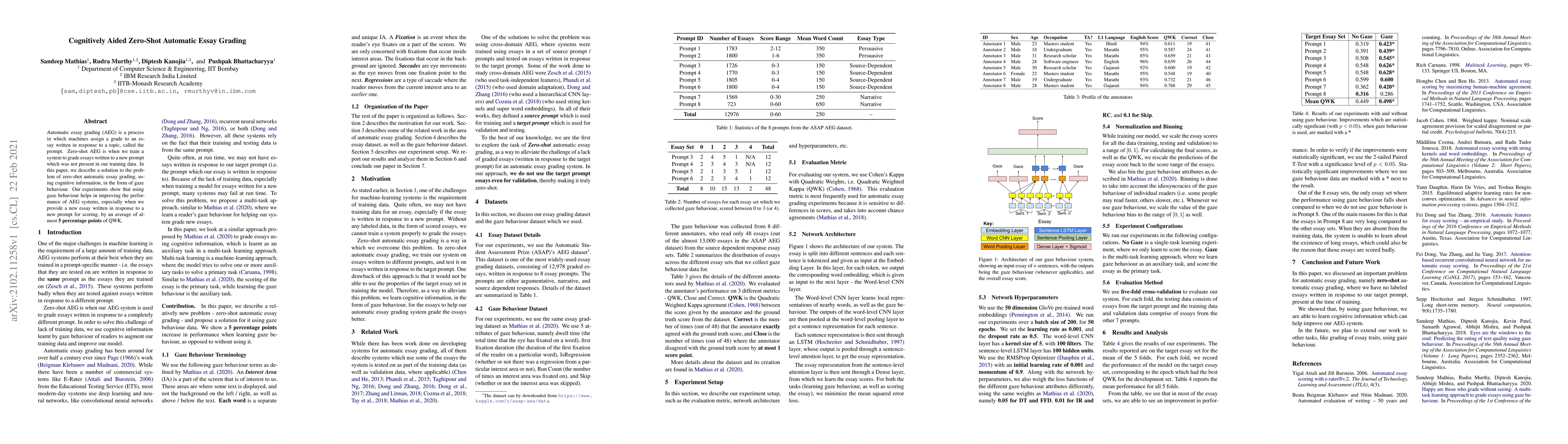 Automatic essay grading (AEG) is a process in which machines assign a grade to an essay written in response to a topic, called the prompt. Zero-shot AEG is when we train a system to grade essays written to a new prompt which was not present in our training data. In this paper, we describe a solution to the problem of zero-shot automatic essay grading, using cognitive information, in the form of gaze behaviour. Our experiments show that using gaze behaviour helps in improving the performance of AEG systems, especially when we provide a new essay written in response to a new prompt for scoring, by an average of almost 5 percentage points of QWK.
