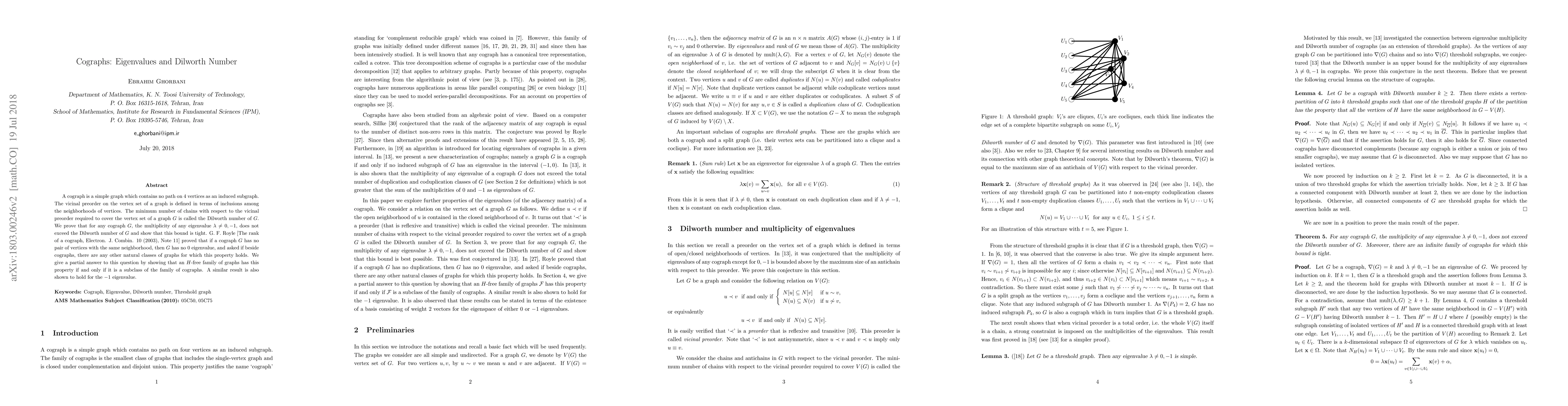A cograph is a simple graph which contains no path on 4 vertices as an induced subgraph. The vicinal preorder on the vertex set of a graph is defined in terms of inclusions among the neighborhoods of vertices. The minimum number of chains with respect to the vicinal preorder required to cover the vertex set of a graph $G$ is called the Dilworth number of $G$. We prove that for any cograph $G$, the multiplicity of any eigenvalue $\lambda\ne0,-1$, does not exceed the Dilworth number of $G$ and show that this bound is tight. G. F. Royle [The rank of a cograph, Electron. J. Combin. 10 (2003), Note 11] proved that if a cograph $G$ has no pair of vertices with the same neighborhood, then $G$ has no 0 eigenvalue, and asked if beside cographs, there are any other natural classes of graphs for which this property holds. We give a partial answer to this question by showing that an $H$-free family of graphs has this property if and only if it is a subclass of the family of cographs. A similar result is also shown to hold for the $-1$ eigenvalue.