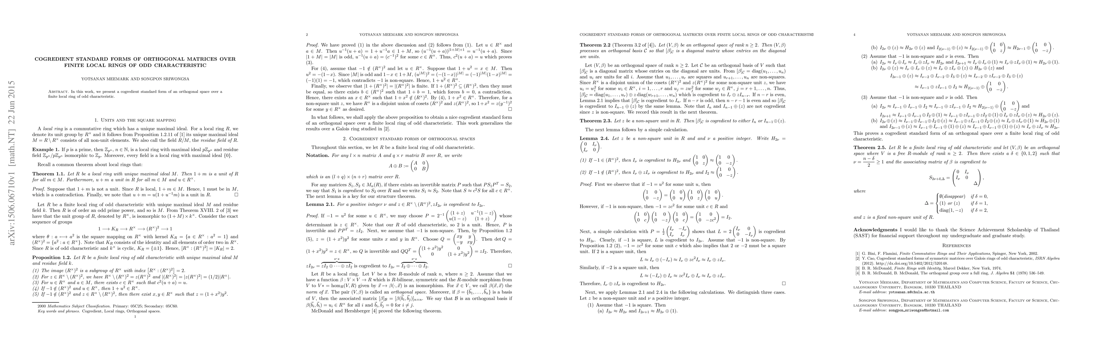 This research identifies a cogredient standard form for orthogonal spaces over finite local rings with odd characteristic, contributing to algebraic structures in number theory and coding theory.