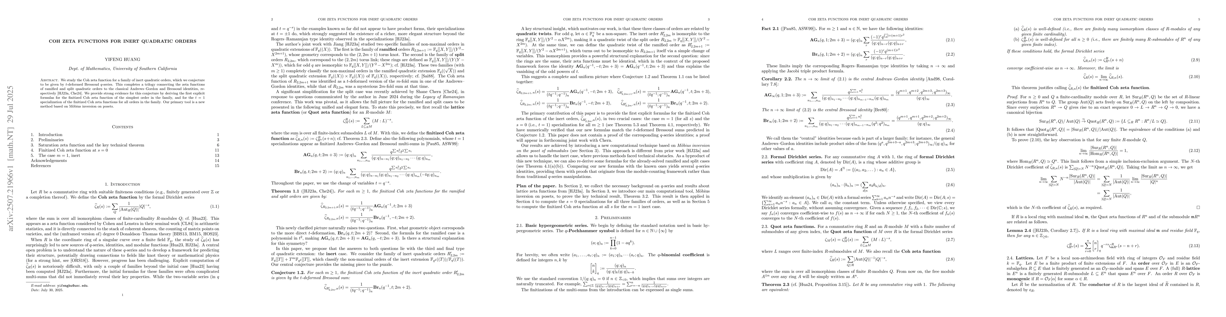 We study the Coh zeta function for a family of inert quadratic orders, which we conjecture to be given by $t$-deformed Bressoud $q$-series. This completes a trilogy connecting the zeta functions of ramified and split quadratic orders to the classical Andrews--Gordon and Bressoud identities, respectively. We provide strong evidence for this conjecture by deriving the first explicit formulas for the finitized Coh zeta function of the simplest order in the family, and for the $t=1$ specialization of the finitized Coh zeta functions for all orders in the family. Our primary tool is a new method based on M\"obius inversion on posets.