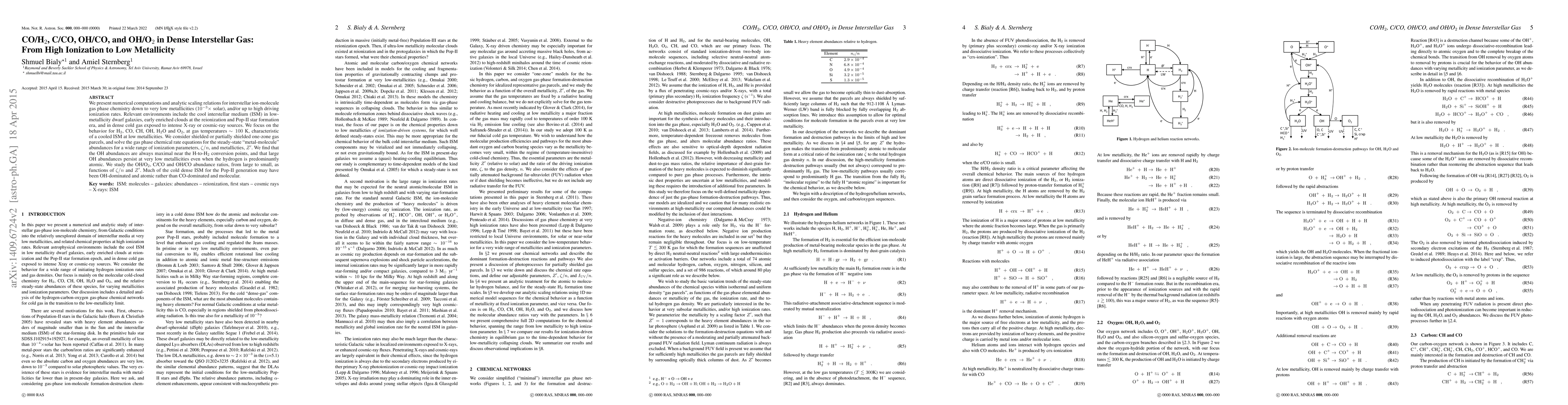 This paper investigates interstellar ion-molecule chemistry in dense, low-metallicity gas environments, focusing on the abundance ratios of CO, H$_2$, OH, and O$_2$. The study finds that OH abundances are maximized near the H-to-H$_2$ transition and remain significant even at very low metallicities, suggesting that much of the cold dense ISM in early galaxies may have been OH-dominated rather than CO-dominated.
