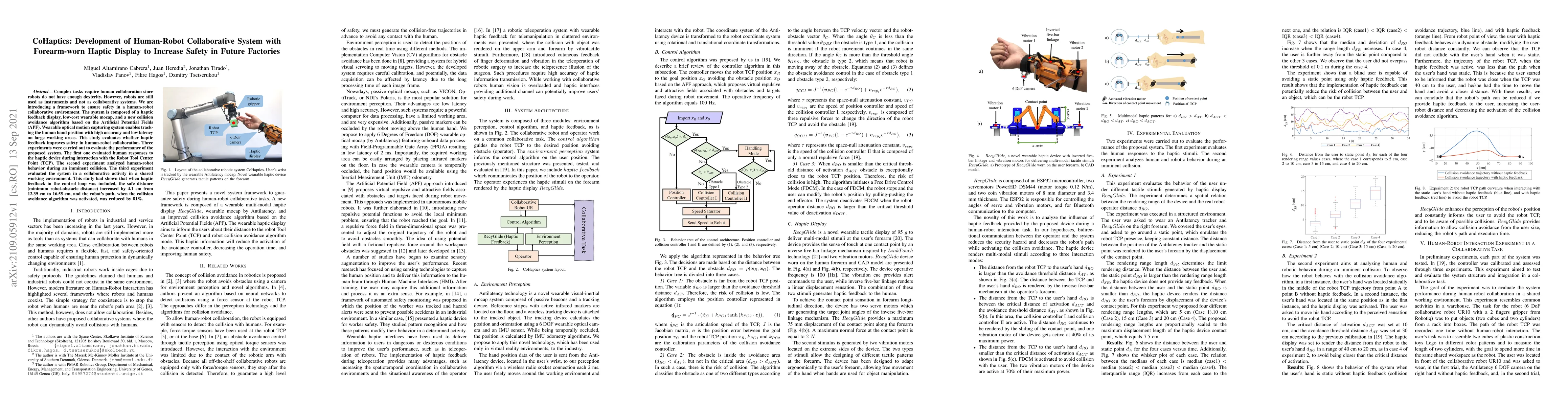 This study develops a human-robot collaborative system with a forearm-worn haptic display to enhance safety in industrial settings. Experiments show that haptic feedback increases the safe distance by 4.1 cm and reduces the robot's path during collision avoidance by 81%.