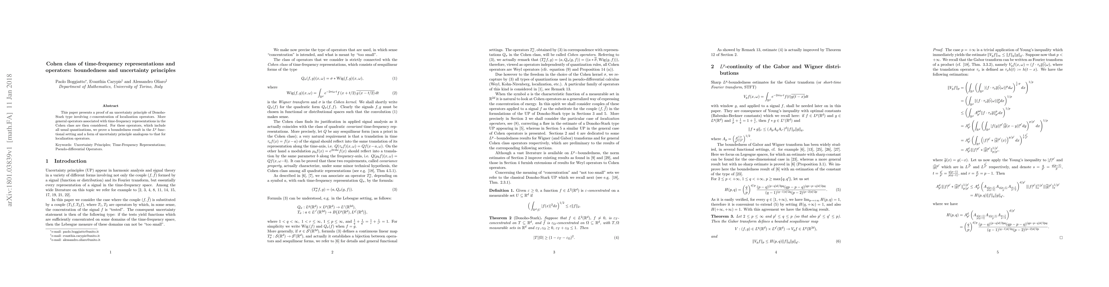 This paper presents a proof of an uncertainty principle of Donoho-Stark type involving $\varepsilon$-concentration of localization operators. More general operators associated with time-frequency representations in the Cohen class are then considered. For these operators, which include all usual quantizations, we prove a boundedness result in the $L^p$ functional setting and a form of uncertainty principle analogous to that for localization operators.