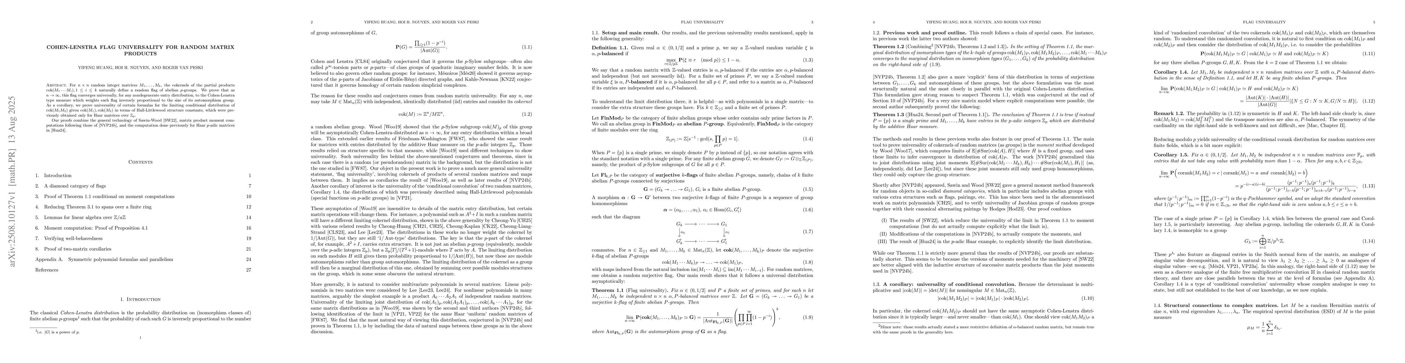 For $n \times n$ random integer matrices $M_1,\ldots,M_k$, the cokernels of the partial products $\mathrm{cok}(M_1 \cdots M_i), 1 \leq i \leq k$ naturally define a random flag of abelian $p$-groups. We prove that as $n \to \infty$, this flag converges universally, for any nondegenerate entry distribution, to the Cohen-Lenstra type measure which weights each flag inversely proportional to the size of its automorphism group. As a corollary, we prove universality of certain formulas for the limiting conditional distribution of $\mathrm{cok}(M_1M_2)$ given $\mathrm{cok}(M_1),\mathrm{cok}(M_2)$ in terms of Hall-Littlewood structure constants, which were previously obtained only for Haar matrices over $\mathbb{Z}_p$. Our proofs combine the general technology of Sawin-Wood, matrix product moment computations following those of Nguyen-Van Peski, and the computation done previously for Haar $p$-adic matrices by Huang.