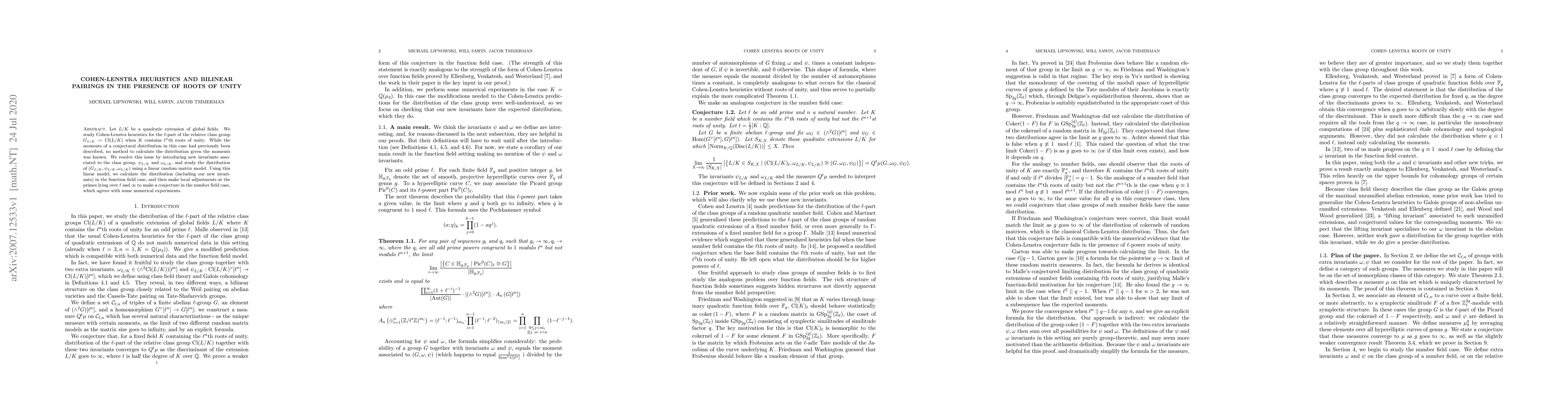 Let $L/K$ be a quadratic extension of global fields. We study Cohen-Lenstra heuristics for the $\ell$-part of the relative class group $G_{L/K} := \textrm{Cl}(L/K)$ when $K$ contains $\ell^n$th roots of unity. While the moments of a conjectural distribution in this case had previously been described, no method to calculate the distribution given the moments was known. We resolve this issue by introducing new invariants associated to the class group, $\psi_{L/K}$ and $\omega_{L/K},$ and study the distribution of $(G_{L/K}, \psi_{L/K}, \omega_{L/K})$ using a linear random matrix model. Using this linear model, we calculate the distribution (including our new invariants) in the function field case, and then make local adjustments at the primes lying over $\ell$ and $\infty$ to make a conjecture in the number field case, which agrees with some numerical experiments.