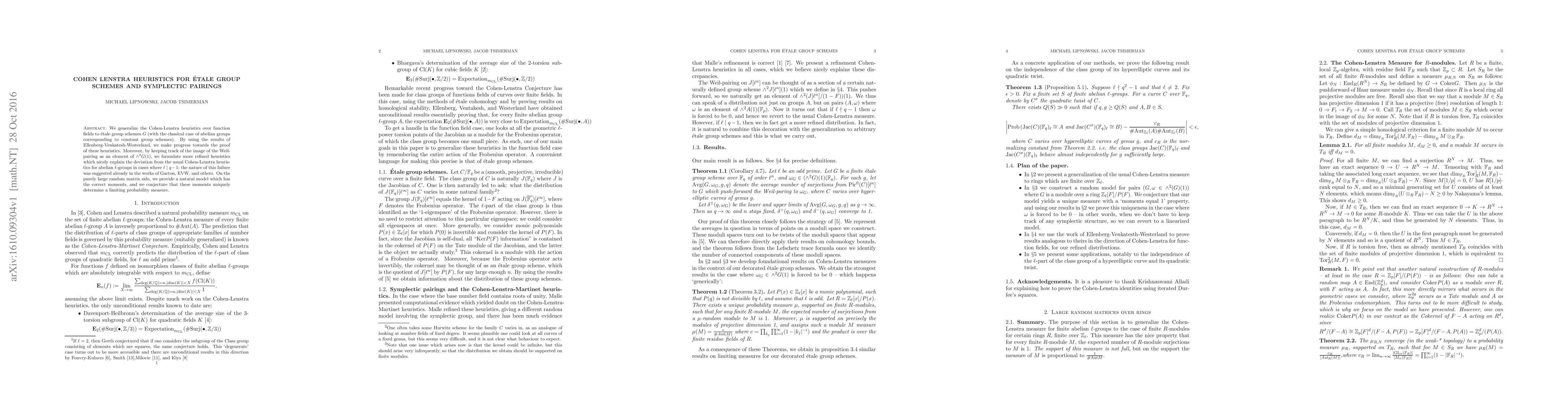 This paper generalizes Cohen-Lenstra heuristics to étale group schemes over function fields, extending the classical case of abelian groups. It also introduces refined heuristics using symplectic pairings to explain deviations from usual Cohen-Lenstra heuristics for abelian ℓ-groups when ℓ divides q-1.