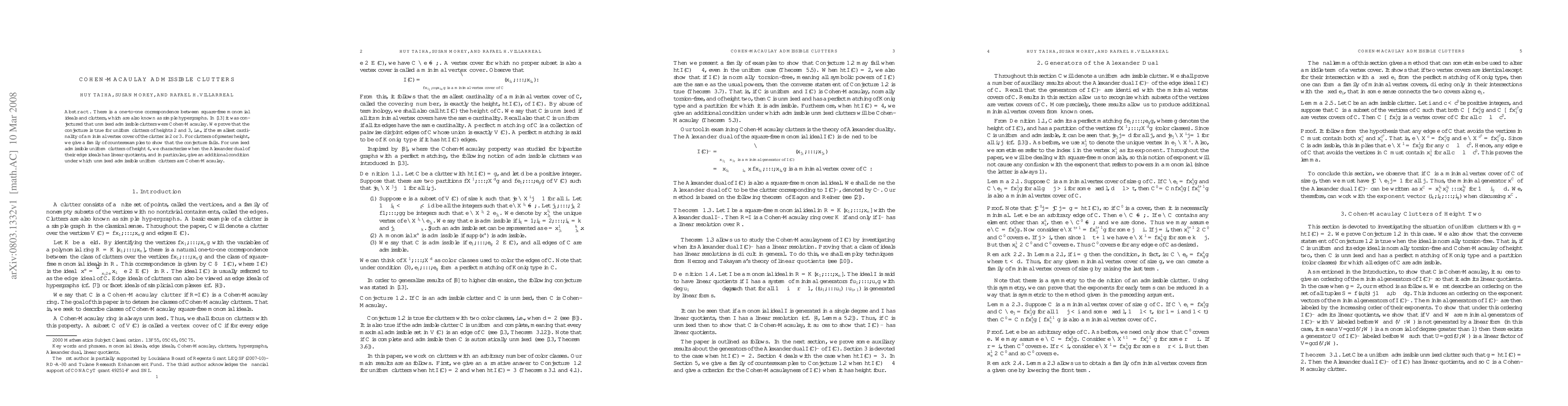 This paper establishes the conjecture that unmixed admissible clutters are Cohen-Macaulay for uniform cases of heights 2 and 3. However, it presents counterexamples for higher heights, except for height 4, where an additional condition is identified to ensure the conjecture holds.