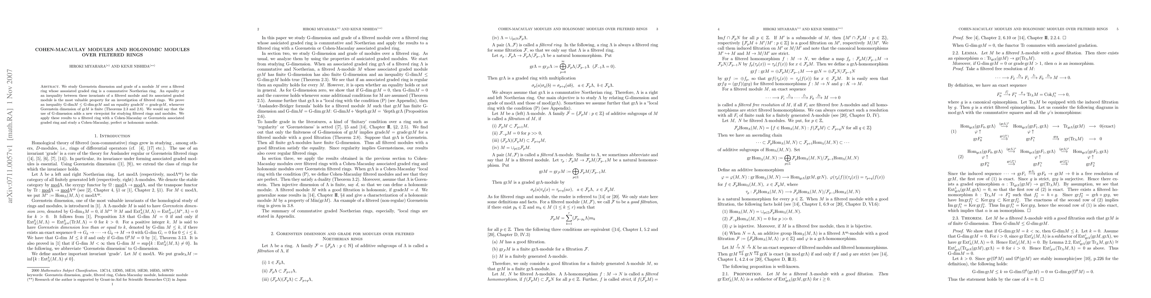 We study Gorenstein dimension and grade of a module $M$ over a filtered ring whose assosiated graded ring is a commutative Noetherian ring. An equality or an inequality between these invariants of a filtered module and its associated graded module is the most valuable property for an investigation of filtered rings. We prove an inequality G-dim$M\leq{G-dim gr}M$ and an equality ${\rm grade}M={\rm grade gr}M$, whenever Gorenstein dimension of ${\rm gr}M$ is finite (Theorems 2.3 and 2.8). We would say that the use of G-dimension adds a new viewpoint for studying filtered rings and modules. We apply these results to a filtered ring with a Cohen-Macaulay or Gorenstein associated graded ring and study a Cohen-Macaulay, perfect or holonomic module.