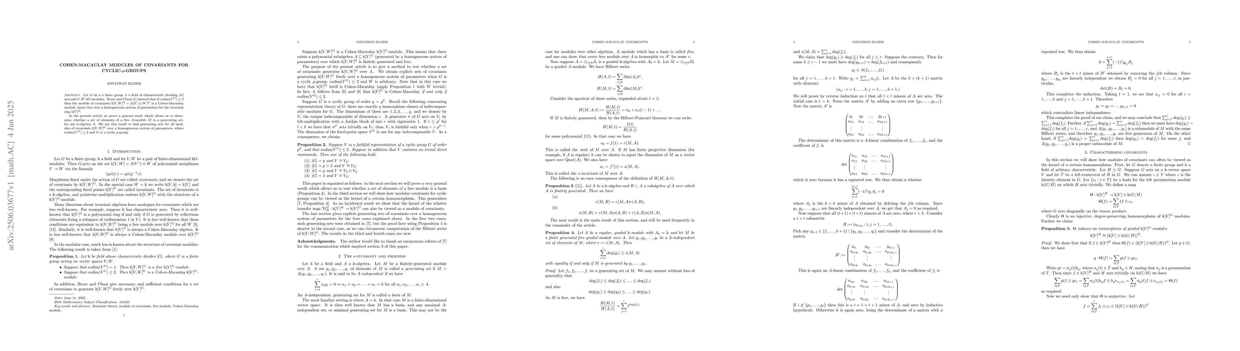 The paper presents a method to identify generating sets for modules of covariants, leveraging a general result about sets in free A-modules, specifically for cyclic p-groups under given codimension constraints.