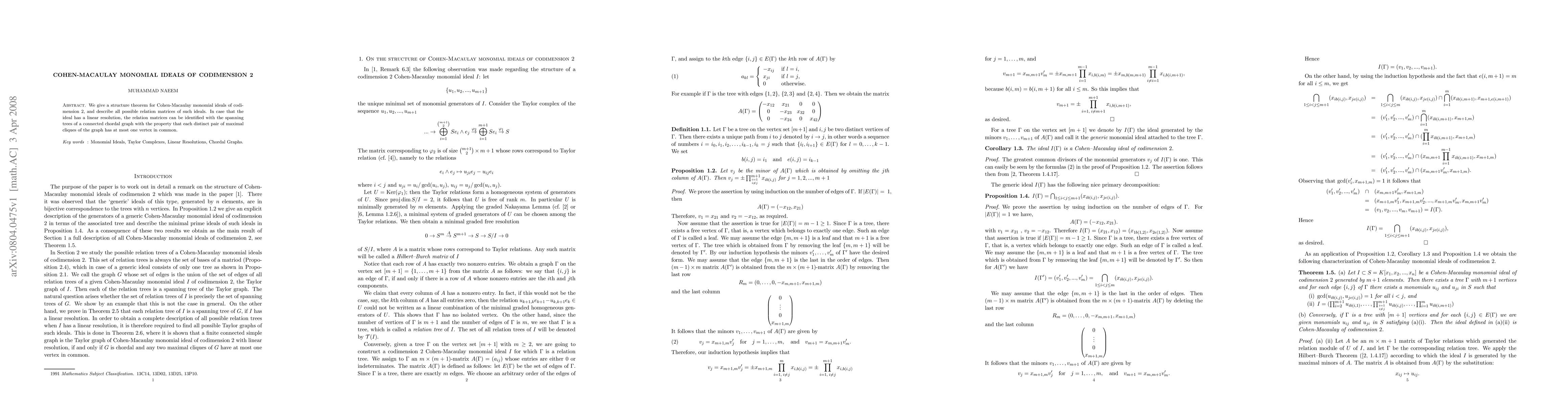 This paper presents a structure theorem for Cohen-Macaulay monomial ideals of codimension 2, detailing all possible relation matrices. For ideals with linear resolution, these matrices correspond to spanning trees of a specific connected chordal graph with unique vertex overlap between maximal cliques.