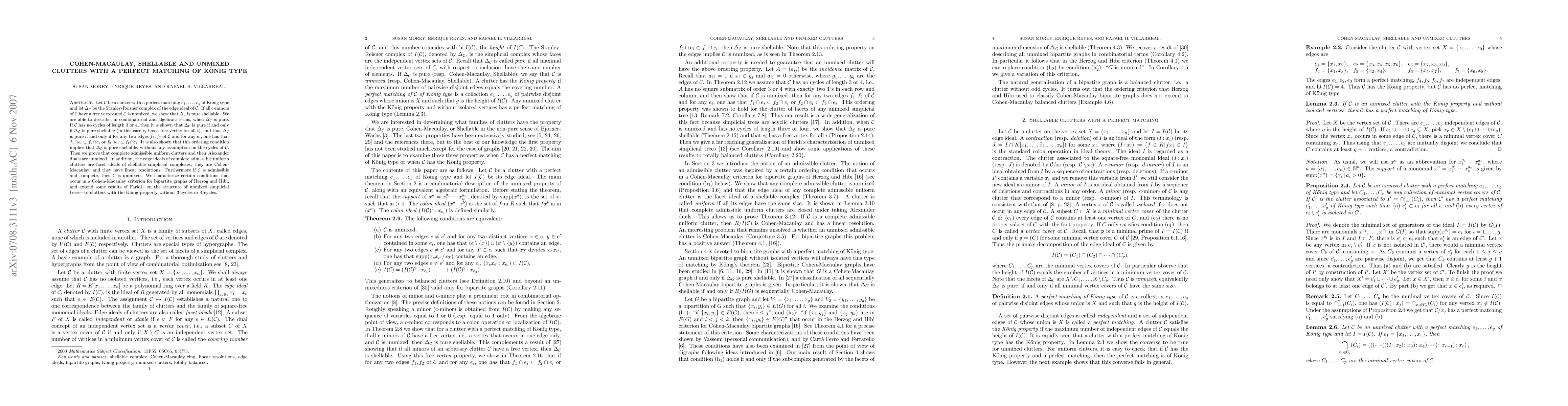 Let $\mathcal{C}$ be a clutter with a perfect matching $e_1,...,e_g$ of K\"onig type and let $\Delta_\mathcal{C}$ be the Stanley-Reisner complex of the edge ideal of $\mathcal{C}$. If all c-minors of $\mathcal{C}$ have a free vertex and $\mathcal{C}$ is unmixed, we show that $\Delta_\mathcal{C}$ is pure shellable. We are able to describe, in combinatorial and algebraic terms, when $\Delta_\mathcal{C}$ is pure. If $\mathcal{C}$ has no cycles of length 3 or 4, then it is shown that $\Delta_\mathcal{C}$ is pure if and only if $\Delta_\mathcal{C}$ is pure shellable (in this case $e_i$ has a free vertex for all $i$), and that $\Delta_\mathcal{C}$ is pure if and only if for any two edges $f_1,f_2$ of $\mathcal{C}$ and for any $e_i$, one has that $f_1\cap e_i\subset f_2\cap e_i$ or $f_2\cap e_i\subset f_1\cap e_i$. It is also shown that this ordering condition implies that $\Delta_\mathcal{C}$ is pure shellable, without any assumption on the cycles of $\mathcal{C}$. Then we prove that complete admissible uniform clutters and their Alexander duals are unmixed. In addition, the edge ideals of complete admissible uniform clutters are facet ideals of shellable simplicial complexes, they are Cohen-Macaulay, and they have linear resolutions. Furthermore if $ \mathcal{C}$ is admissible and complete, then $\mathcal{C}$ is unmixed. We characterize certain conditions that occur in a Cohen-Macaulay criterion for bipartite graphs of Herzog and Hibi, and extend some results of Faridi--on the structure of unmixed simplicial trees--to clutters with the K\"onig property without 3-cycles or 4-cycles.