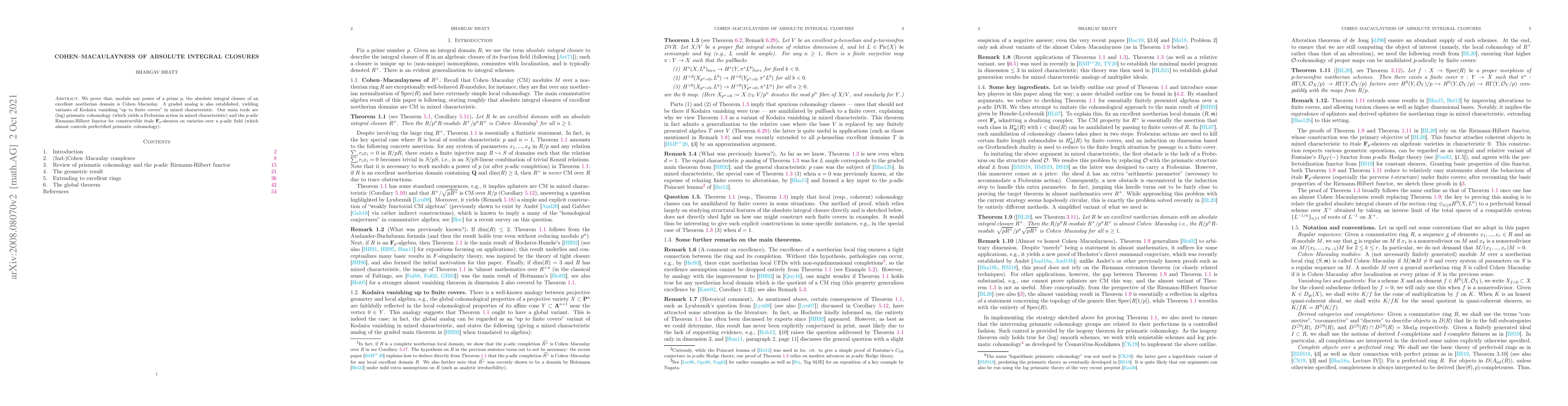 We prove that, modulo any power of a prime $p$, the absolute integral closure of an excellent noetherian domain is Cohen-Macaulay. A graded analog is also established, yielding variants of Kodaira vanishing "up to finite covers" in mixed characteristic. Our main tools are (log) prismatic cohomology (which yields a Frobenius action in mixed characteristic) and the $p$-adic Riemann-Hilbert functor for constructible \'etale $\mathbf{F}_p$-sheaves on varieties over a $p$-adic field (which almost controls perfectified prismatic cohomology).