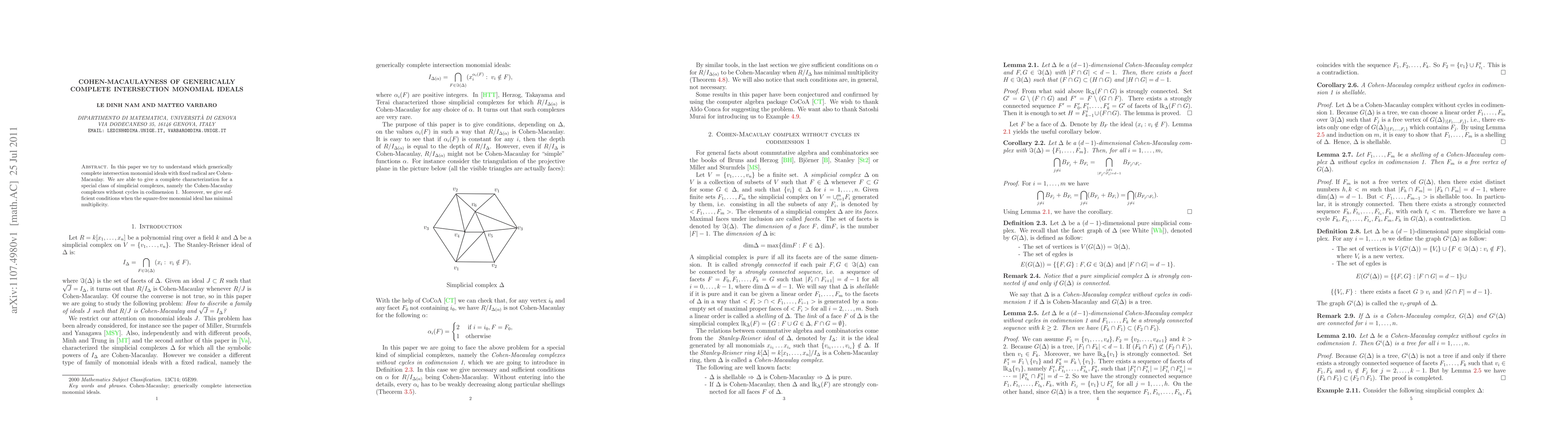 This paper characterizes the Cohen-Macaulay property for generically complete intersection monomial ideals with a fixed radical, focusing on those associated with specific classes of simplicial complexes. The study aims to determine when these ideals meet the Cohen-Macaulay criterion.