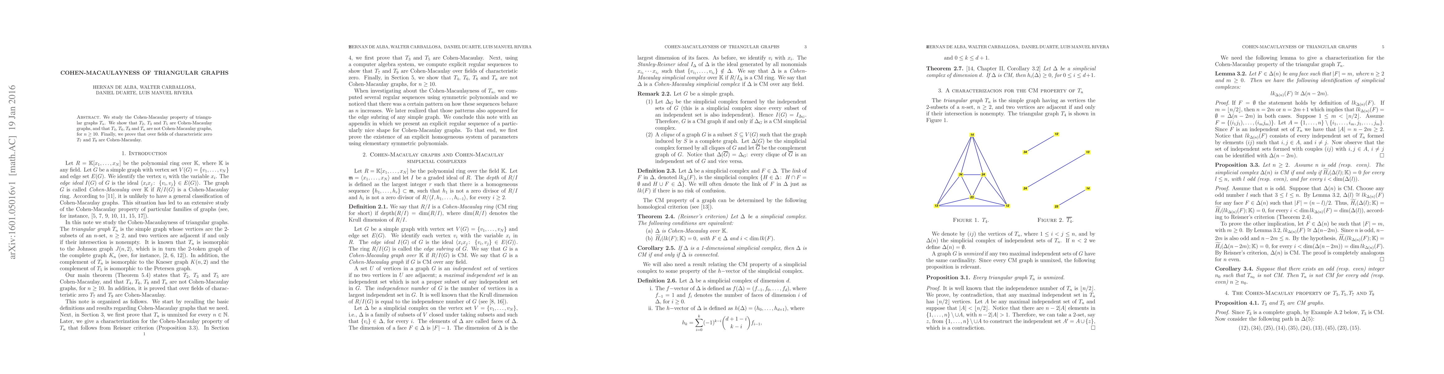 This paper investigates the Cohen-Macaulay property of triangular graphs T_n, showing that some small triangular graphs (T_2 to T_5) and larger ones (T_7 and T_9) are Cohen-Macaulay, while most are not.