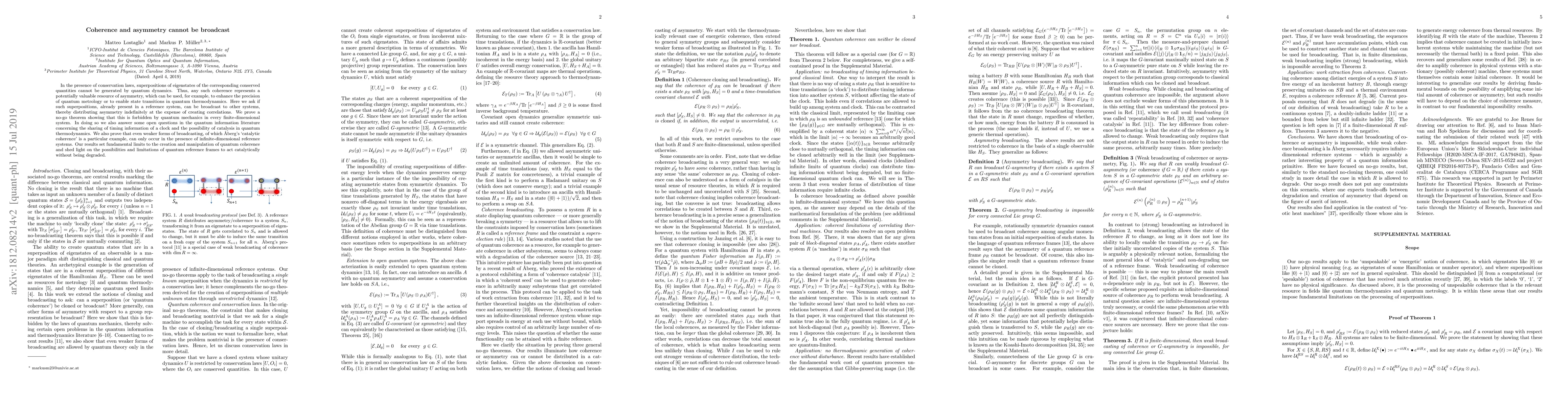 In the presence of conservation laws, superpositions of eigenstates of the corresponding conserved quantities cannot be generated by quantum dynamics. Thus, any such coherence represents a potentially valuable resource of asymmetry, which can be used, for example, to enhance the precision of quantum metrology or to enable state transitions in quantum thermodynamics. Here we ask if such superpositions, already present in a reference system, can be broadcast to other systems, thereby distributing asymmetry indefinitely at the expense of creating correlations. We prove a no-go theorem showing that this is forbidden by quantum mechanics in every finite-dimensional system. In doing so we also answer some open questions in the quantum information literature concerning the sharing of timing information of a clock and the possibility of catalysis in quantum thermodynamics. We also prove that even weaker forms of broadcasting, of which Aberg's `catalytic coherence' is a particular example, can only occur in the presence of infinite-dimensional reference systems. Our results set fundamental limits to the creation and manipulation of quantum coherence and shed light on the possibilities and limitations of quantum reference frames to act catalytically without being degraded.