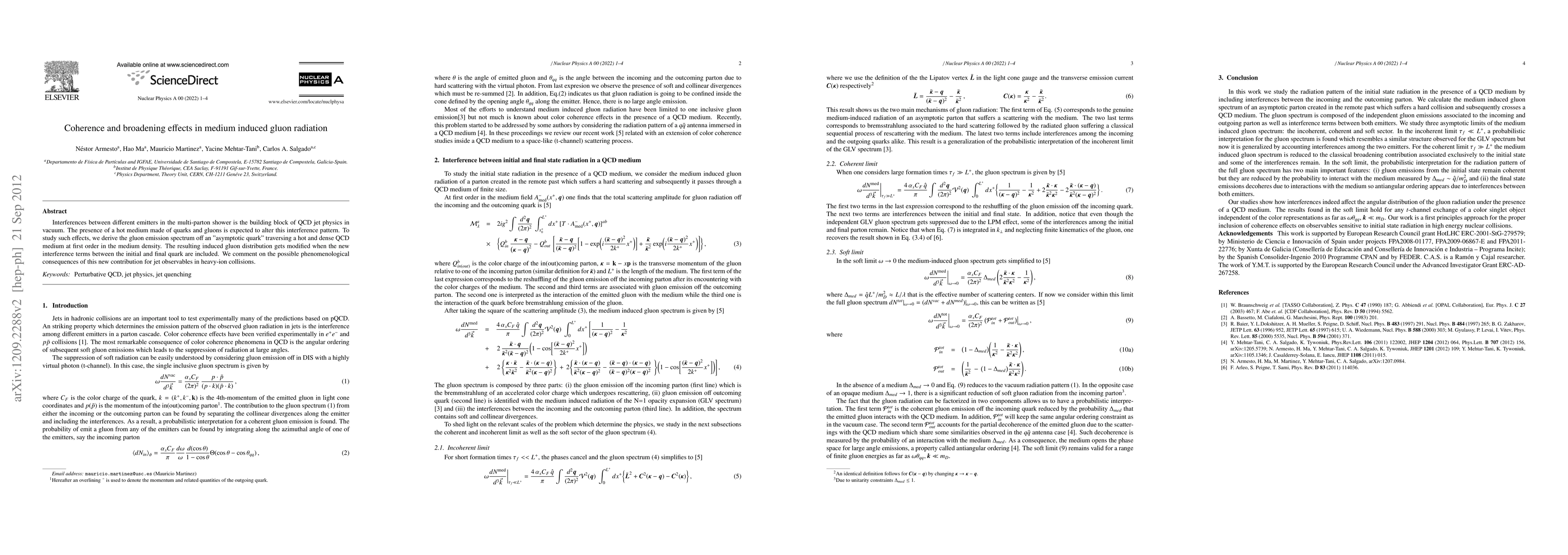 Interferences between different emitters in the multi-parton shower is the building block of QCD jet physics in vacuum. The presence of a hot medium made of quarks and gluons is expected to alter this interference pattern. To study such effects, we derive the gluon emission spectrum off an "asymptotic quark" traversing a hot and dense QCD medium at first order in the medium density. The resulting induced gluon distribution gets modified when the new interference terms between the initial and final quark are included. We comment on the possible phenomenological consequences of this new contribution for jet observables in heavy-ion collisions.