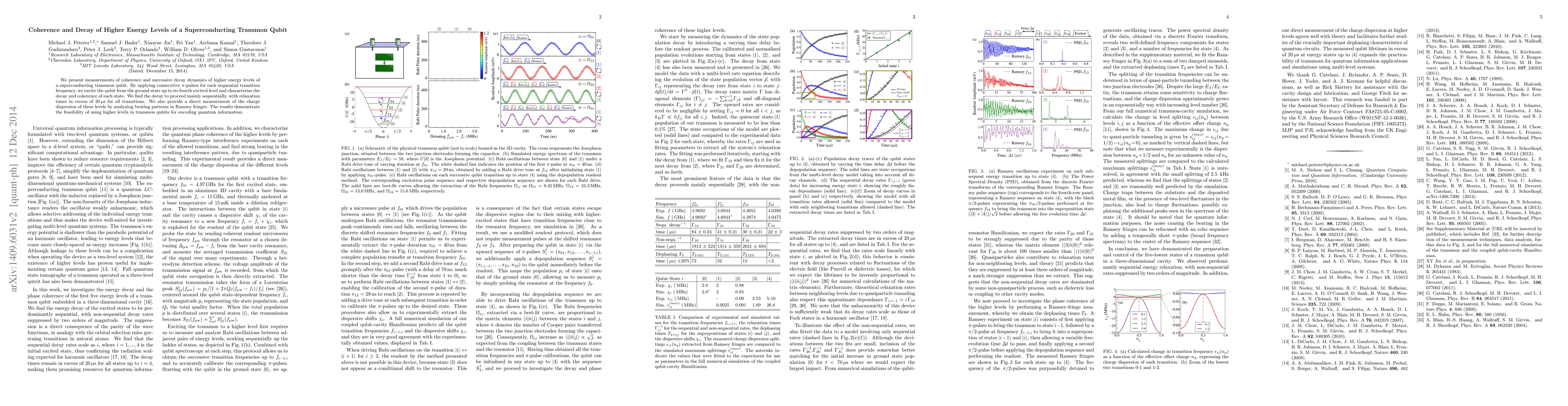 This study investigates the coherence and decay dynamics of higher energy levels in a superconducting transmon qubit, finding sequential decay with relaxation times exceeding 20 µs. The research also directly measures charge dispersion through Ramsey fringe analysis, highlighting the potential for using higher levels in transmon qubits for quantum information encoding.