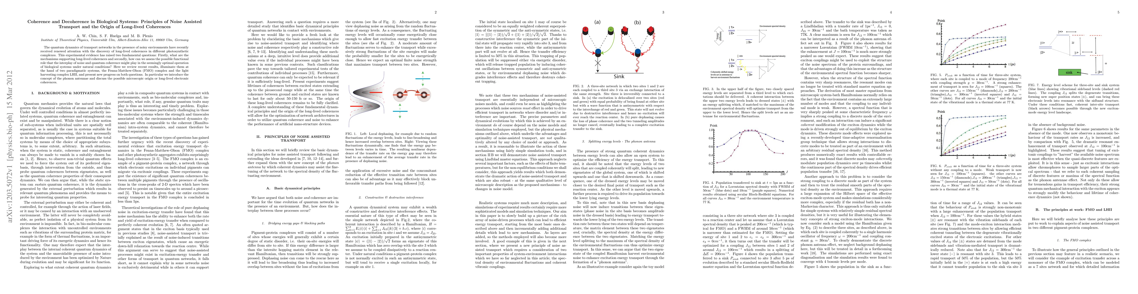 The quantum dynamics of transport networks in the presence of noisy environments have recently received renewed attention with the discovery of long-lived coherences in different photosynthetic complexes. This experimental evidence has raised two fundamental questions: Firstly, what are the mechanisms supporting long-lived coherences and secondly, how can we assess the possible functional role that the interplay of noise and quantum coherence might play in the seemingly optimal operation of biological systems under natural conditions? Here we review recent results, illuminate them at the hand of two paradigmatic systems, the Fenna-Matthew-Olson (FMO) complex and the light harvesting complex LHII, and present new progress on both questions. In particular we introduce the concept of the phonon antennae and discuss the possible microscopic origin or long-lived electronic coherences.
