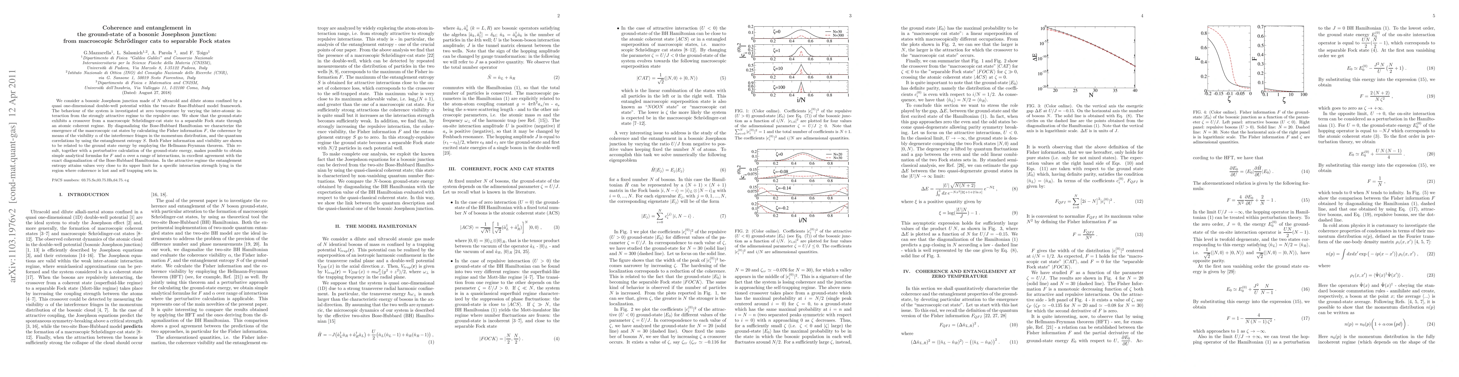 We consider a bosonic Josephson junction made of $N$ ultracold and dilute atoms confined by a quasi one-dimensional double-well potential within the two-site Bose-Hubbard model framework. The behaviour of the system is investigated at zero temperature by varying the inter-atomic interaction from the strongly attractive regime to the repulsive one. We show that the ground-state exhibits a crossover from a macroscopic Schr\"odinger-cat state to a separable Fock state through an atomic coherent regime. By diagonalizing the Bose-Hubbard Hamiltonian we characterize the emergence of the mascroscopic cat states by calculating the Fisher information $F$, the coherence by means of the visibility $\alpha$ of the interference fringes in the momentum distribution, and the quantum correlations by using the entanglement entropy $S$. Both Fisher information and visibility are shown to be related to the ground state energy by employing the Hellmann-Feynman theorem. This result, together with a perturbative calculation of the ground-state energy, makes possible to obtain simple analytical formulas for $F$ and $\alpha$ over a range of interactions, in excellent agreement with the exact diagonalization of the Bose-Hubbard Hamiltonian. In the attractive regime the entanglement entropy attains values very close to its upper limit for a specific interaction strength lying in the region where coherence is lost and self trapping sets in.