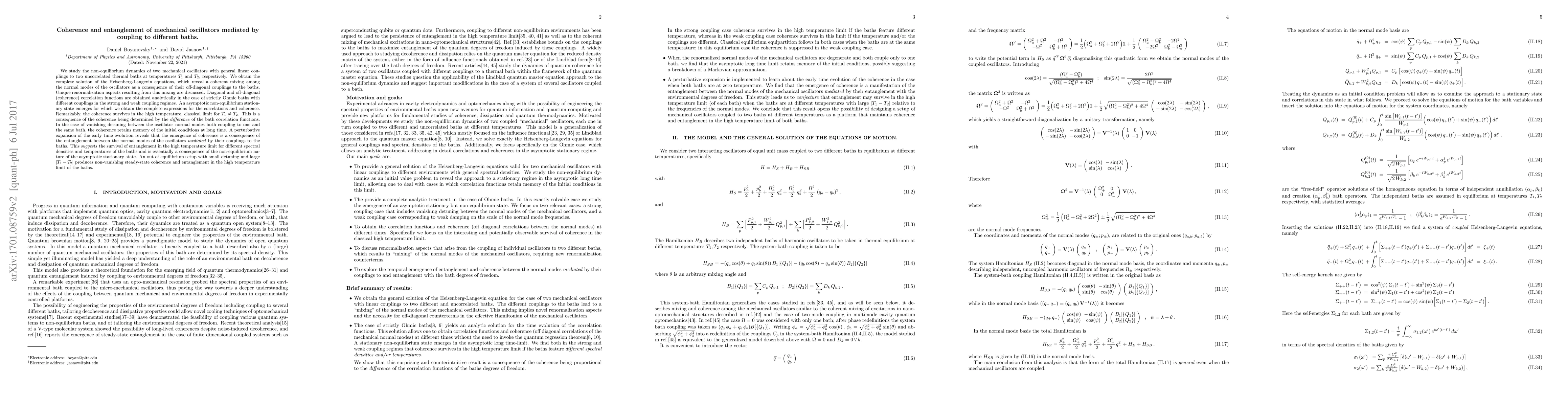 This paper investigates the non-equilibrium dynamics of two coupled mechanical oscillators interacting with distinct thermal baths, revealing coherent mixing and entanglement in their normal modes. The study finds that coherence and entanglement persist in high temperature limits, suggesting non-equilibrium dynamics can maintain quantum features even when temperatures differ.