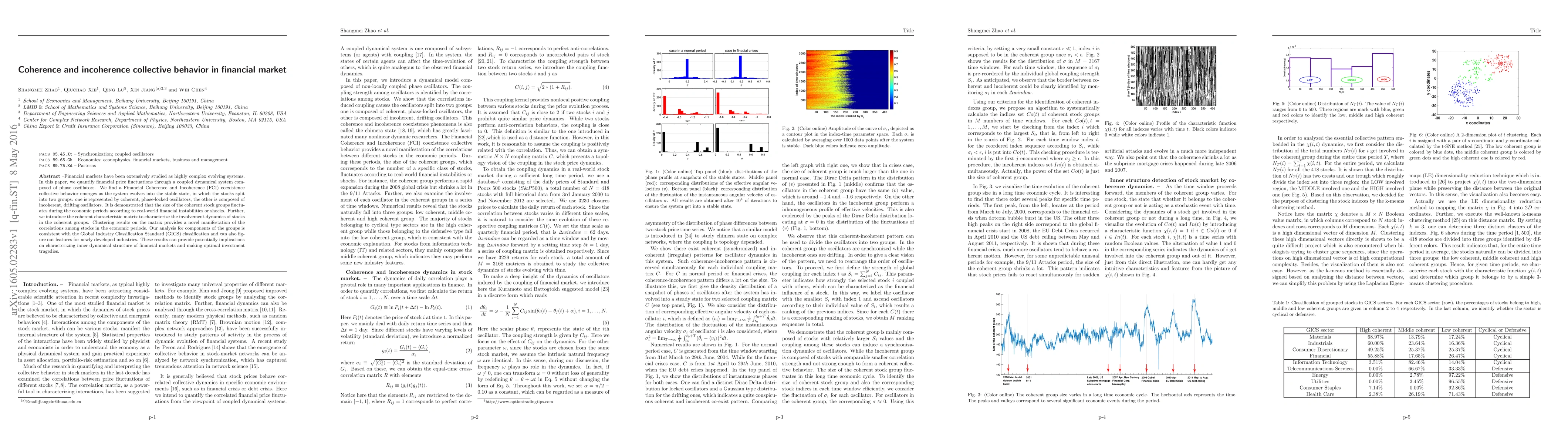 Financial markets have been extensively studied as highly complex evolving systems. In this paper, we quantify financial price fluctuations through a coupled dynamical system composed of phase oscillators. We find a Financial Coherence and Incoherence (FCI) coexistence collective behavior emerges as the system evolves into the stable state, in which the stocks split into two groups: one is represented by coherent, phase-locked oscillators, the other is composed of incoherent, drifting oscillators. It is demonstrated that the size of the coherent stock groups fluctuates during the economic periods according to real-world financial instabilities or shocks. Further, we introduce the coherent characteristic matrix to characterize the involvement dynamics of stocks in the coherent groups. Clustering results on the matrix provides a novel manifestation of the correlations among stocks in the economic periods. Our analysis for components of the groups is consistent with the Global Industry Classification Standard (GICS) classification and can also figure out features for newly developed industries. These results can provide potentially implications on characterizing inner dynamical structure of financial markets and making optimal investment tragedies.