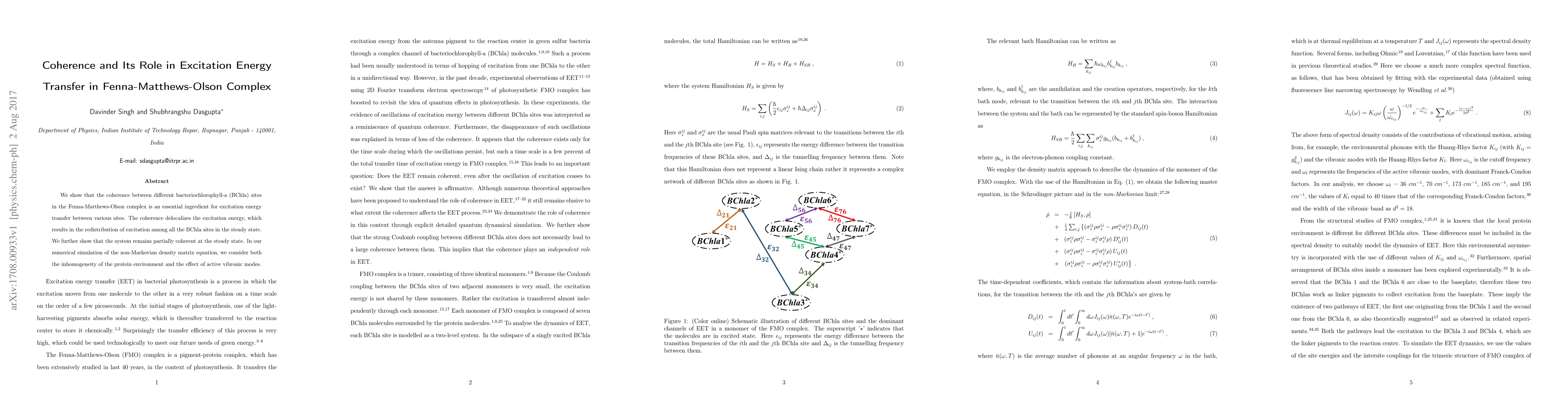 This paper demonstrates that coherence between bacteriochlorophyll-a sites in the Fenna-Mathews-Olson complex is crucial for efficient excitation energy transfer. The study shows that coherence delocalizes excitation energy, leading to its redistribution among all sites, and the system retains partial coherence at steady state.